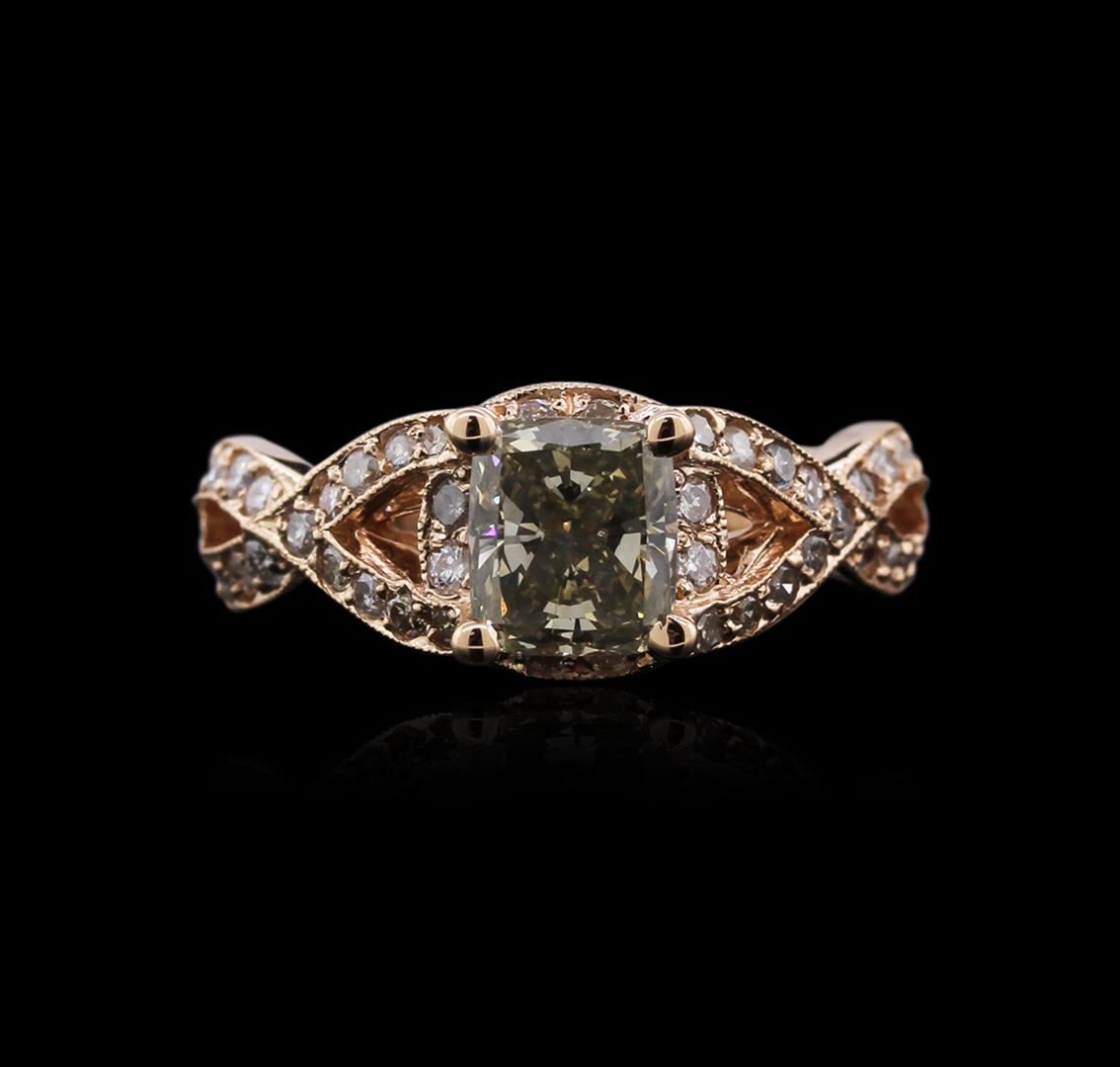 One electronically tested 14KT rose gold ladies cast diamond ring with a bright polish finish. Identified with markings of "14K". Condition is new. Containing: One prong set cushion cut diamond, measuring 6.50 x 5.80 x 4.11mm (depth est.) approximate weight of 1.32ct. Clarity: SI-1, color of Fancy Light Green, Cut is Good. Whether the color of this diamond is of natural origin or an artificial process cannot currently be determined. Forty-Six prong set round brilliant cut diamonds, measuring 1.50 - 1.30 x 0.84mm (depth est.) approximate total weight of 46 Stones = 0.46ct. Clarity: I-1 to I-2. Color: J - K. All diamonds are graded in the mounting, unless otherwise stated. Total Weight of Diamonds 1.78ct. Total Weight of Ring 4.30 grams. GGL Appraised at $5,995.00.