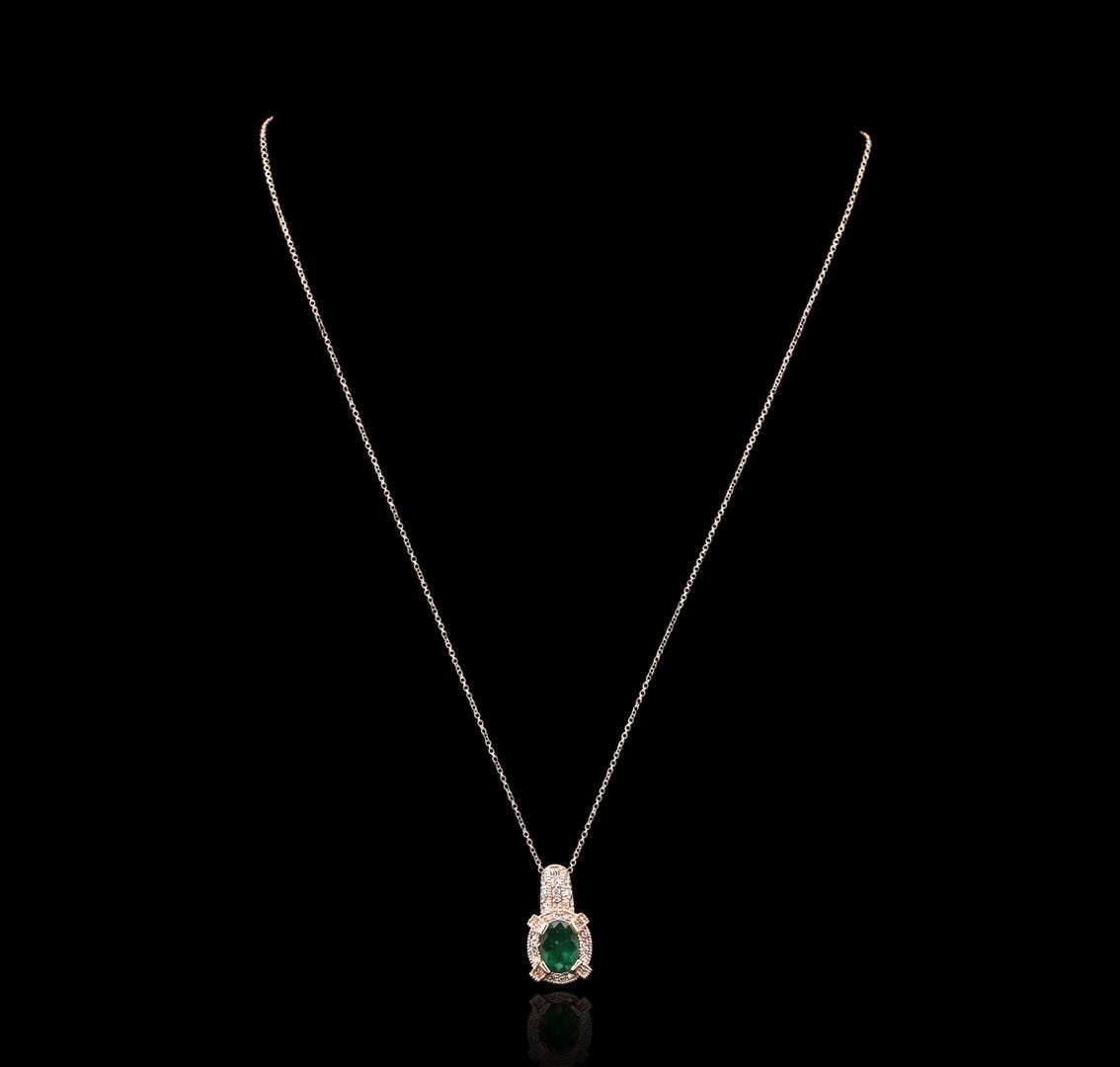 One pendant with chain featuring: 14KT rose gold weighing 4.06 grams containing one emerald with a total weight of 1.83ct and round diamonds with a total weight of 0.40cts.
