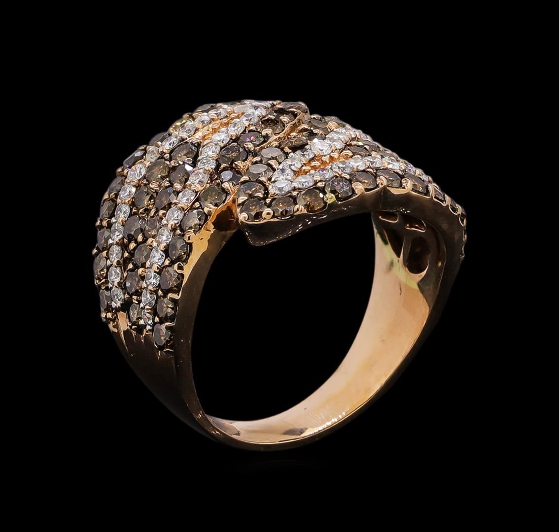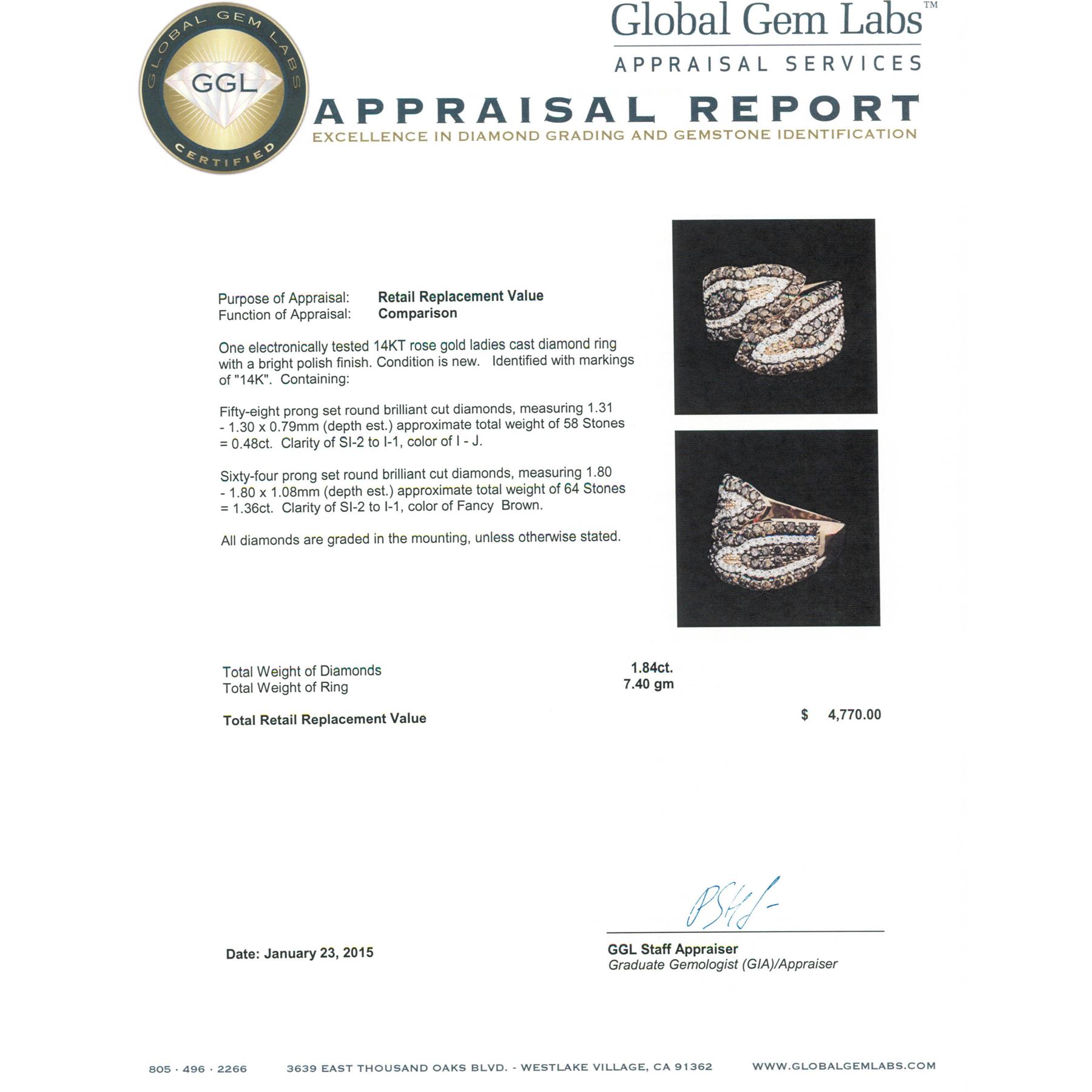 One electronically tested 14KT rose gold ladies cast diamond ring with a bright polish finish. Identified with markings of "14K". Condition is new. Containing: Fifty-Eight prong set round brilliant cut diamonds, measuring 1.31 - 1.30 x 0.79mm (depth est.) approximate total weight of 58 Stones = 0.48ct. Clarity: SI-2 to I-1. Color: I - J. Sixty-Four prong set round brilliant cut diamonds, measuring 1.80 - 1.80 x 1.08mm (depth est.) approximate total weight of 64 Stones = 1.36ct. Clarity: SI-2 to I-1. All diamonds are graded in the mounting, unless otherwise stated. Total Weight of Diamonds 1.84ct. Total Weight of Ring 7.40 grams. GGL Appraised at $4,770.00.