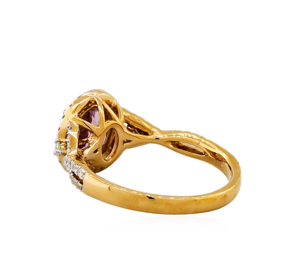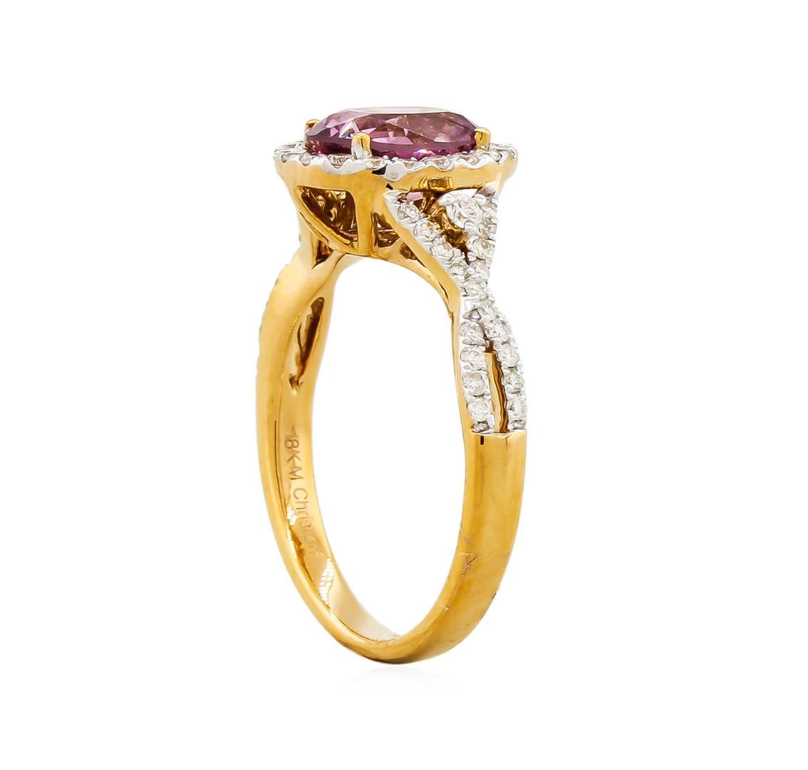 Elegant spinel and diamond ring set in 3.60 grams of 48KT rose gold featuring a 1.84 carat spinel center stone surrounded by fifty-eight round diamonds which extend halfway down each side of the band totaling 0.44 carats.