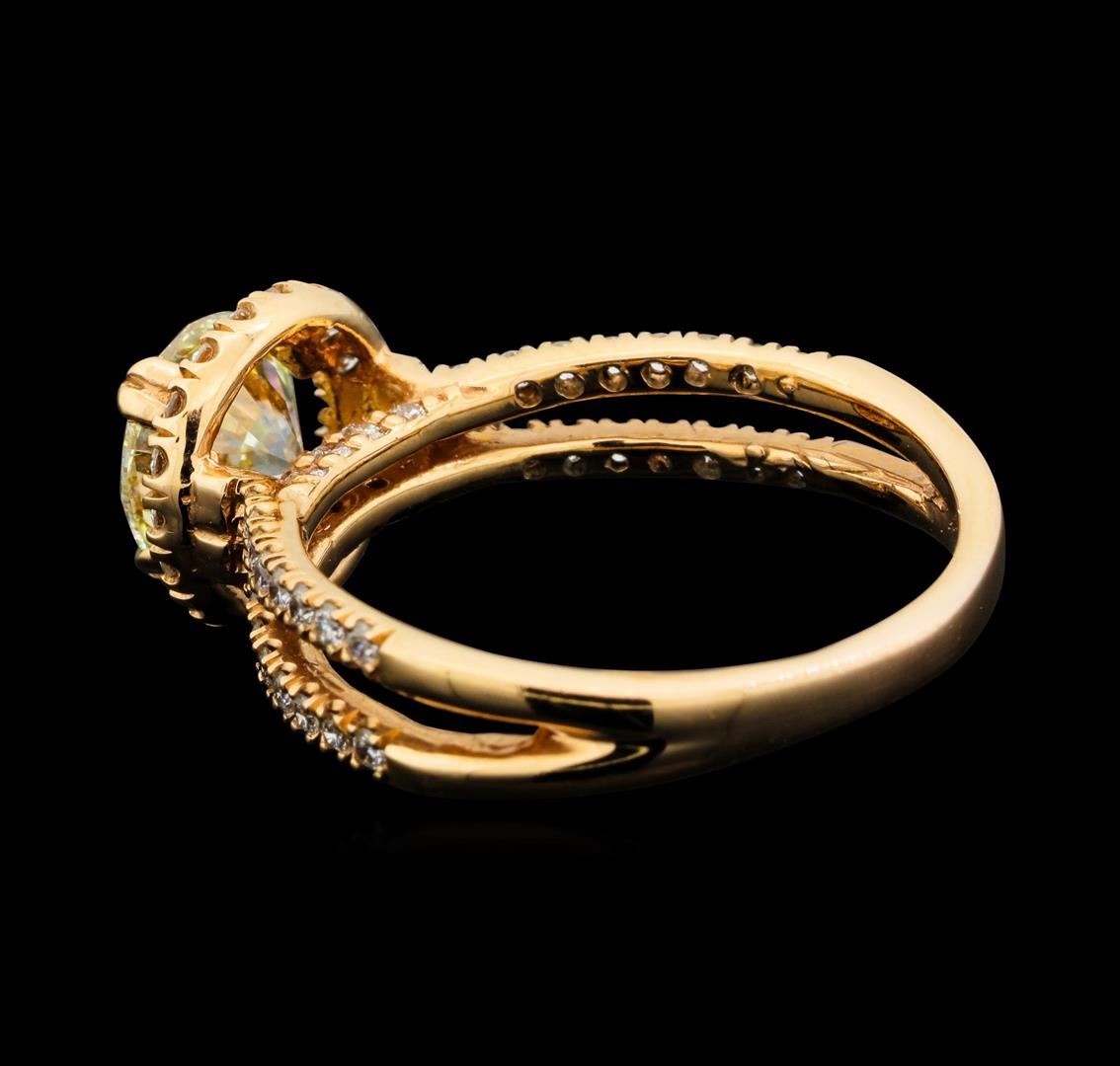 One electronically tested 14KT rose gold lady's cast wedding ring with a split cathedral shank with a halo with a bright polish finish. The featured lady's ring has a shank measuring 2.00 millimeters wide. Identified with markings of "14K". Condition is new, good workmanship. Containing: One prong set round brilliant cut diamond, measuring 7.05 - 7.02 x 4.40mm (depth est.) approximate weight of 1.35ct. Graded in the setting. Clarity: SI-2. Color: L - MCut Very Good Fifty-Eight prong set round brilliant cut diamonds, measuring 1.40 - 1.25 x 0.82mm (depth est.) approximate total weight of 58 Stones = 0.50ct. Graded in the setting. Clarity: SI-1 to SI-2. Color: G - HCut Good. Total Weight of Diamonds 1.85ct. Total Weight of Ring 3.40gm. GAS Appraised.