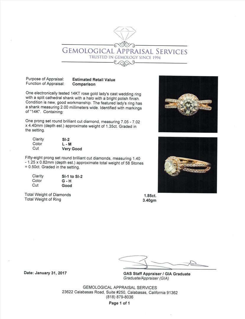 One electronically tested 14KT rose gold lady's cast wedding ring with a split cathedral shank with a halo with a bright polish finish. The featured lady's ring has a shank measuring 2.00 millimeters wide. Identified with markings of "14K". Condition is new, good workmanship. Containing: One prong set round brilliant cut diamond, measuring 7.05 - 7.02 x 4.40mm (depth est.) approximate weight of 1.35ct. Graded in the setting. Clarity: SI-2. Color: L - MCut Very Good Fifty-Eight prong set round brilliant cut diamonds, measuring 1.40 - 1.25 x 0.82mm (depth est.) approximate total weight of 58 Stones = 0.50ct. Graded in the setting. Clarity: SI-1 to SI-2. Color: G - HCut Good. Total Weight of Diamonds 1.85ct. Total Weight of Ring 3.40gm. GAS Appraised.