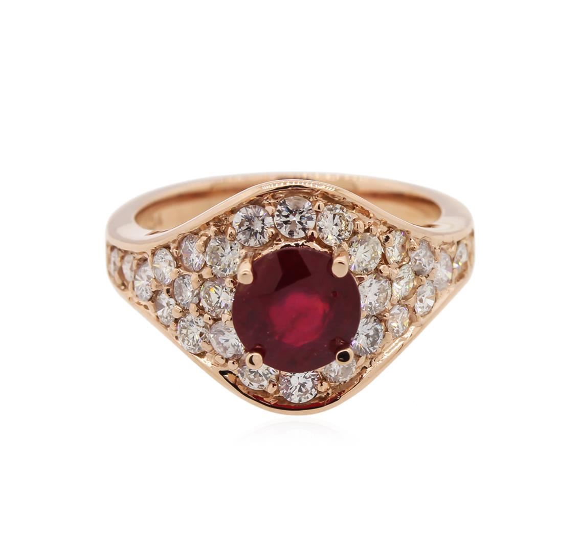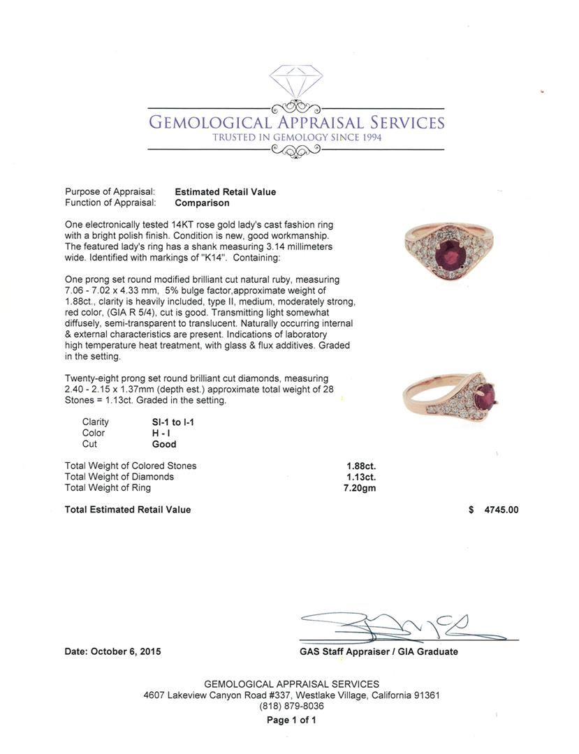 One electronically tested 14KT rose gold lady's cast fashion ring with a bright polish finish. The featured lady's ring has a shank measuring 3.14 millimeters wide. Identified with markings of "K14". Condition is new, good workmanship. Containing: One prong set round modified brilliant cut natural ruby, measuring 7.06 - 7.02 x 4.33 mm, 5% bulge factor, approximate weight of 1.88ct., clarity is heavily included, type II, medium, moderately strong, red color, (GIA R 5/4), cut is good. Transmitting light somewhat diffusely, semi-transparent to translucent. Naturally occurring internal & external characteristics are present. Indications of laboratory high temperature heat treatment, with glass & flux additives. Graded in the setting. Twenty-Eight prong set round brilliant cut diamonds, measuring 2.40 - 2.15 x 1.37mm (depth est.) approximate total weight of 28 Stones = 1.13ct. Graded in the setting. Clarity: SI-1 to I-1. Color: H - I. Cut Good. Total Weight of Colored Stones 1.88ct. Total Weight of Diamonds 1.13ct. Total Weight of Ring 7.20gm. GAS Appraised at $4,745.00.