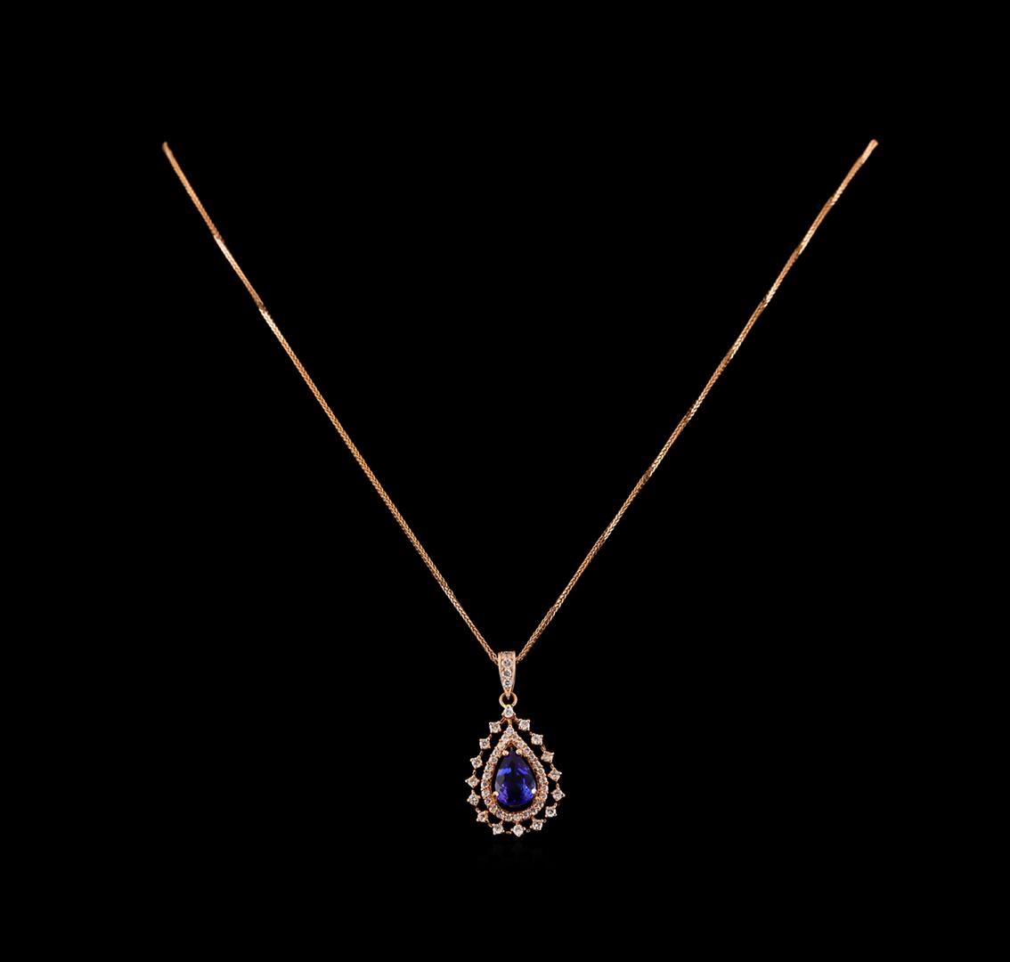 One electronically tested 14KT rose gold ladies cast tanzanite and diamond pendant & chain 18.0" long, herringbone link with a lobster claw clasp with a bright polish finish. Identified with markings of "14K". Condition is new. Containing: One prong set pear modified brilliant cut natural tanzanite, measuring 9.90 x 6.80 x 4.42mm, approximate total weight of 1.99ct., clarity is eye clean, type I, medium light, moderately strong, violet color, (GIA V 4/4), cut is good. Forty-Two prong set round brilliant cut diamonds, measuring 1.70 - 1.30 x 0.90mm (depth est.) approximate total weight of 42 Stones = 0.52ct. Clarity: SI-2 to I-1. Color: I - J, Cut is Good. Five prong set round brilliant cut diamonds, measuring 1.90 - 1.80 x 1.11mm (depth est.) approximate total weight of 5 Stones = 0.12ct. Clarity: SI-2. Color: H - I, Cut is Good. Colored gemstones are presumed to have been subjected to commonly used enhancement processes. All diamonds and colored gemstones are graded in the mounting, unless otherwise stated. Total Weight of Colored Stones 1.99ct. Total Weight of Diamonds 0.63ct. Total Weight of Pendant & Chain 5.40 grams. GGL Appraised at $3,700.00.