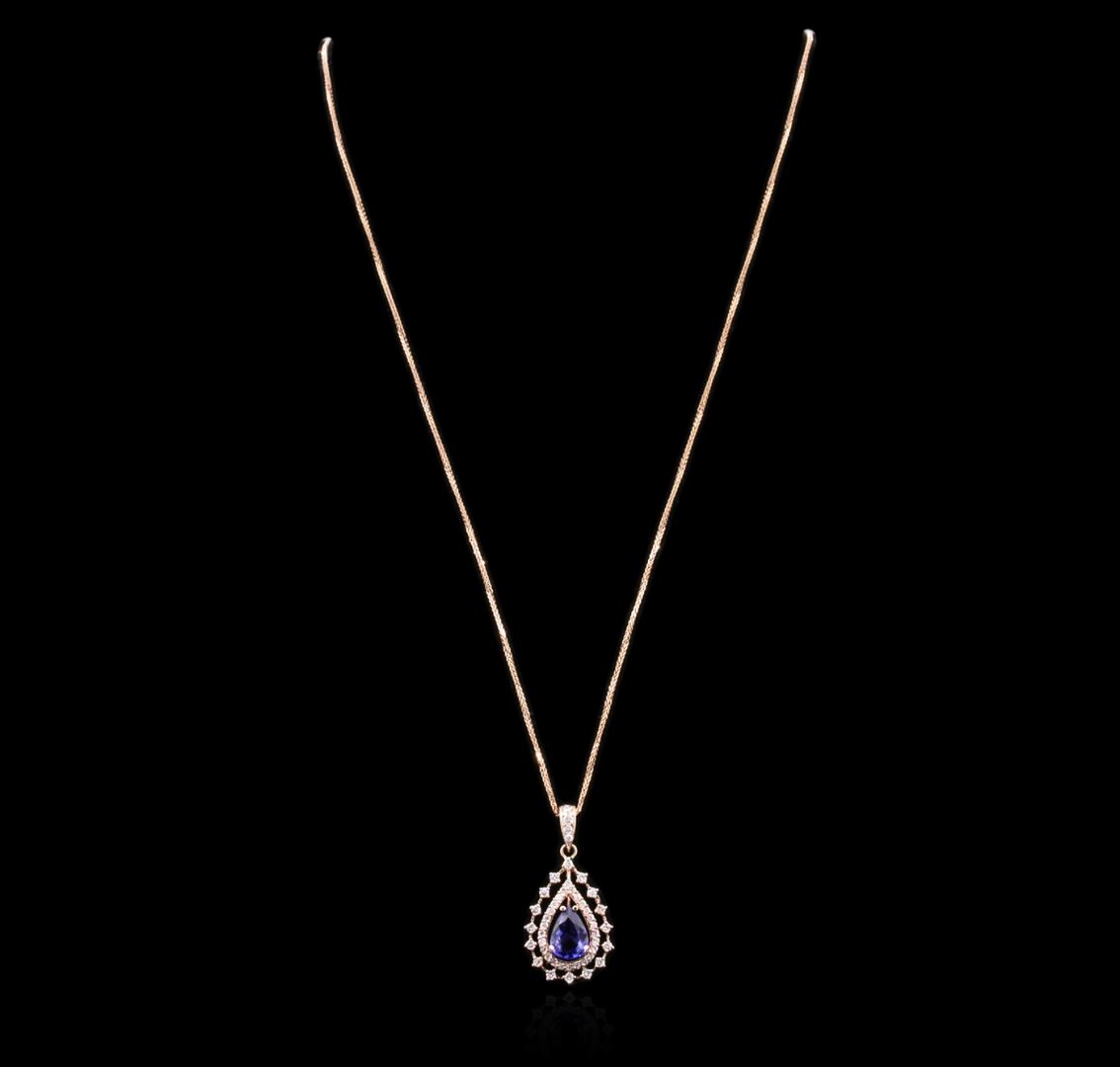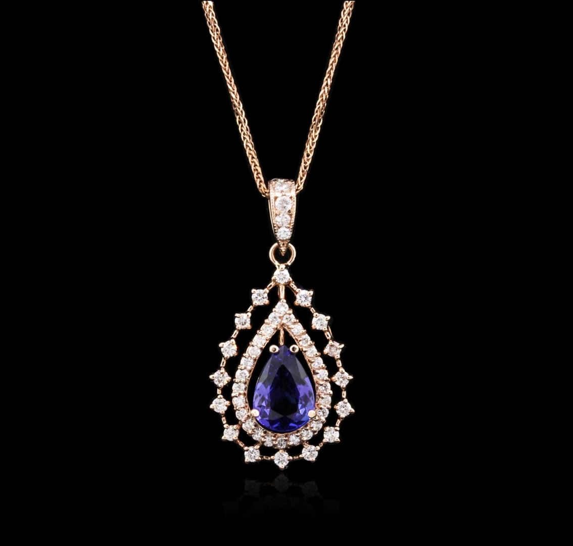 One electronically tested 14KT rose gold ladies cast tanzanite and diamond pendant & chain 18.0" long, herringbone link with a lobster claw clasp with a bright polish finish. Identified with markings of "14K". Condition is new. Containing: One prong set pear modified brilliant cut natural tanzanite, measuring 9.90 x 6.80 x 4.42mm, approximate total weight of 1.99ct., clarity is eye clean, type I, medium light, moderately strong, violet color, (GIA V 4/4), cut is good. Forty-Two prong set round brilliant cut diamonds, measuring 1.70 - 1.30 x 0.90mm (depth est.) approximate total weight of 42 Stones = 0.52ct. Clarity: SI-2 to I-1. Color: I - J, Cut is Good. Five prong set round brilliant cut diamonds, measuring 1.90 - 1.80 x 1.11mm (depth est.) approximate total weight of 5 Stones = 0.12ct. Clarity: SI-2. Color: H - I, Cut is Good. Colored gemstones are presumed to have been subjected to commonly used enhancement processes. All diamonds and colored gemstones are graded in the mounting, unless otherwise stated. Total Weight of Colored Stones 1.99ct. Total Weight of Diamonds 0.63ct. Total Weight of Pendant & Chain 5.40 grams. GGL Appraised at $3,700.00.