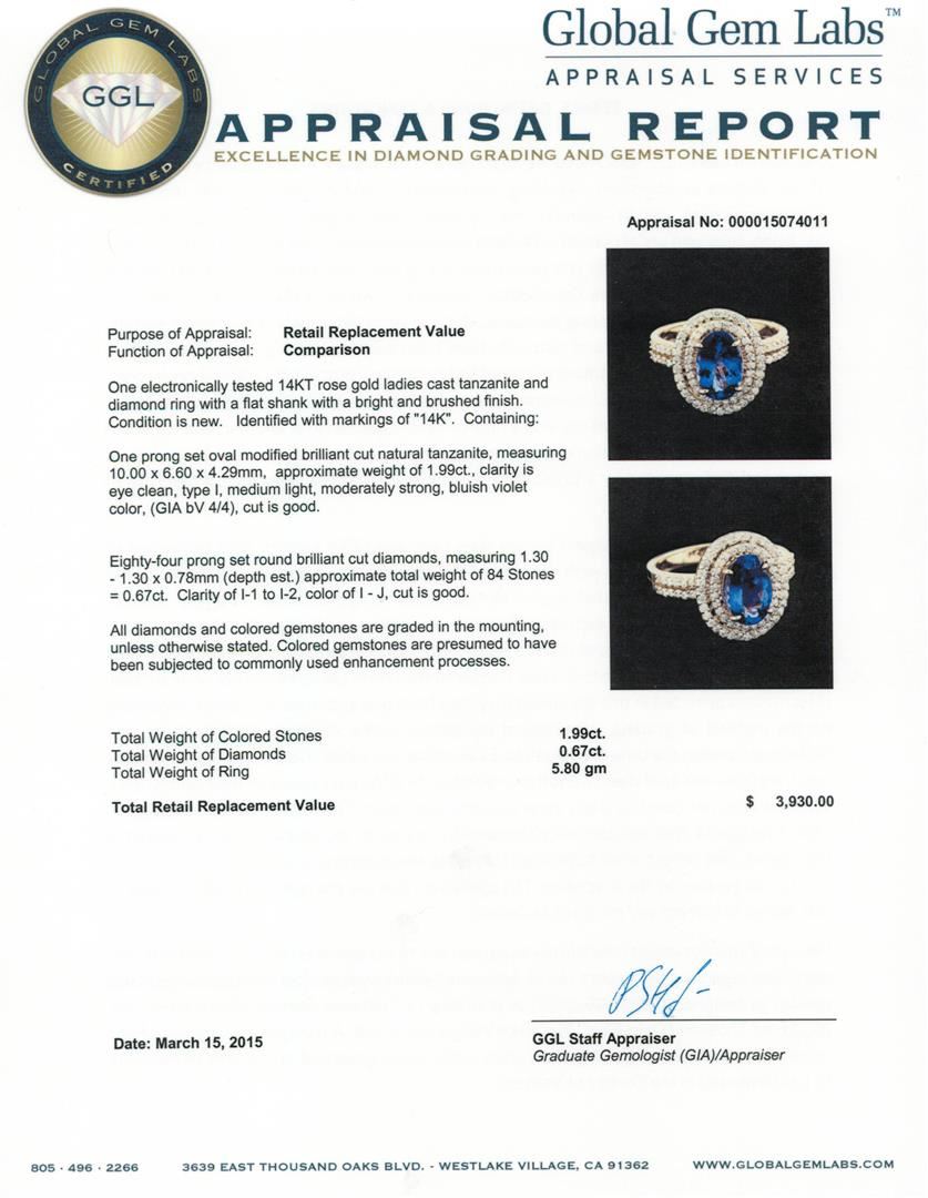 One electronically tested 14KT rose gold ladies cast tanzanite and diamond ring with a flat shank with a bright and brushed finish. Identified with markings of "14K". Condition is new. Containing: One prong set oval modified brilliant cut natural tanzanite, measuring 10.00 x 6.60 x 4.29mm, approximate weight of 1.99ct., clarity is eye clean, type I, medium light, moderately strong, bluish violet color, (GIA bV 4/4), cut is good. Eighty-Four prong set round brilliant cut diamonds, measuring 1.30 - 1.30 x 0.78mm (depth est.) approximate total weight of 84 Stones = 0.67ct. Clarity of I-1 to I-2, Color of I - J, Cut is Good. All diamonds and colored gemstones are graded in the mounting, unless otherwise stated. Colored gemstones are presumed to have been subjected to commonly used enhancement processes. Total Weight of Colored Stones 1.99ct. Total Weight of Diamonds 0.67ct. Total Weight of Ring 5.80 grams. GGL Appraised at $3,930.00.