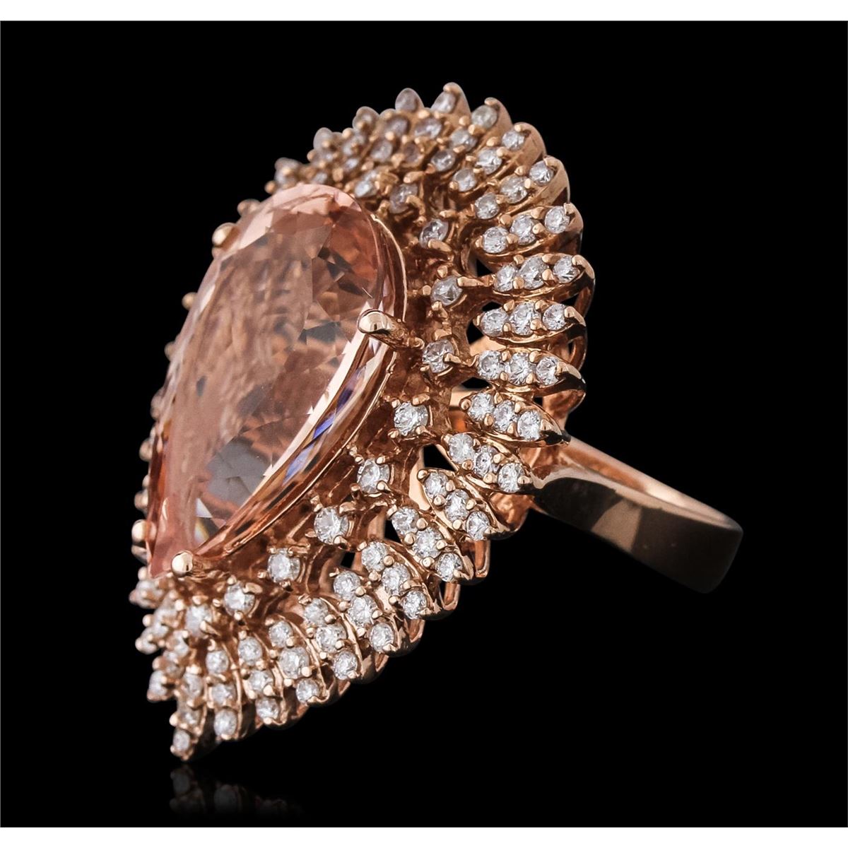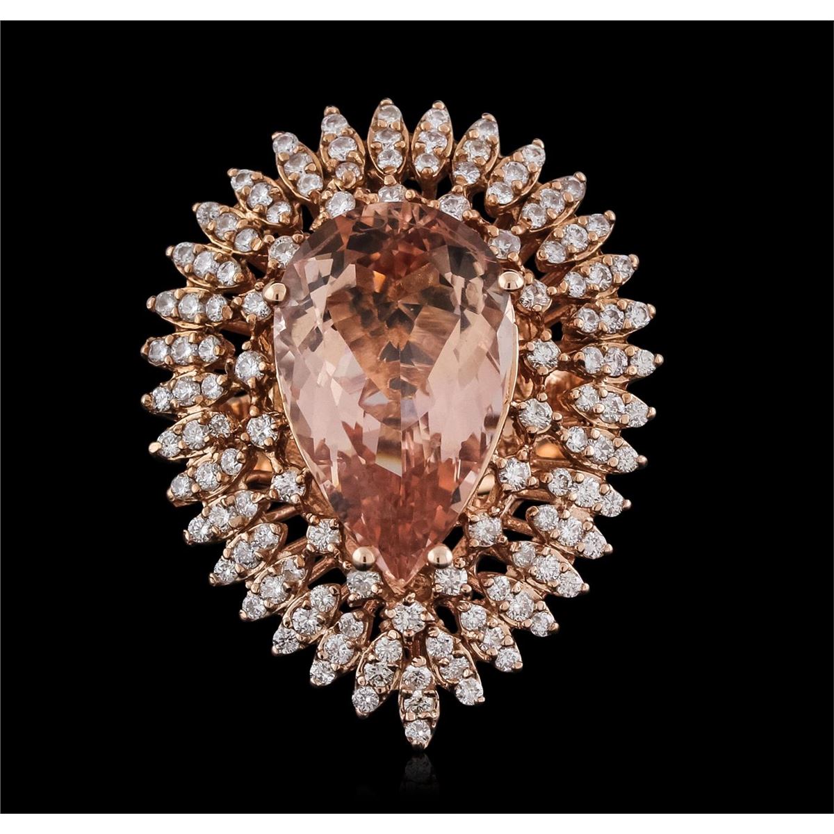 One electronically tested 14KT rose gold ladies combination cast & assembled morganite and diamond ring with a flat shank with a bright polish finish. Identified with markings of "K14". Condition is new. Containing: One prong set pear modified brilliant cut natural morganite, measuring 19.81 x 12.12 x 7.88mm, approximate weight of 10.29ct., clarity is eye clean, type I, light, very slightly brownish, reddish orange color, (GIA rO 3/3), cut is good. One Hundred Twenty prong set round brilliant cut diamonds, measuring 1.50 - 1.30 x 0.84mm (depth est.) approximate total weight of 120 Stones = 1.20ct. Clarity: SI-1 to I-1. Color: I - J, Cut is Good. Colored gemstones are presumed to have been subjected to commonly used enhancement processes. All diamonds and colored gemstones are graded in the mounting, unless otherwise stated. Total Weight of Colored Stones 10.29ct. Total Weight of Diamonds 1.20ct. Total Weight of Ring 14.10 grams. GGL Appraised at $10,580.00.