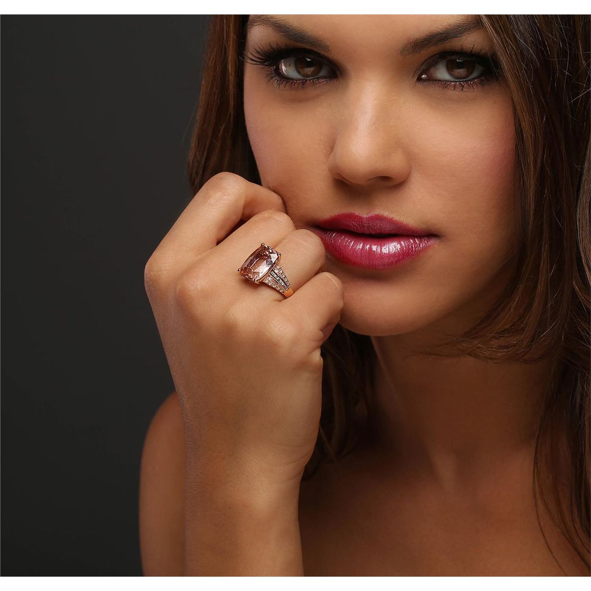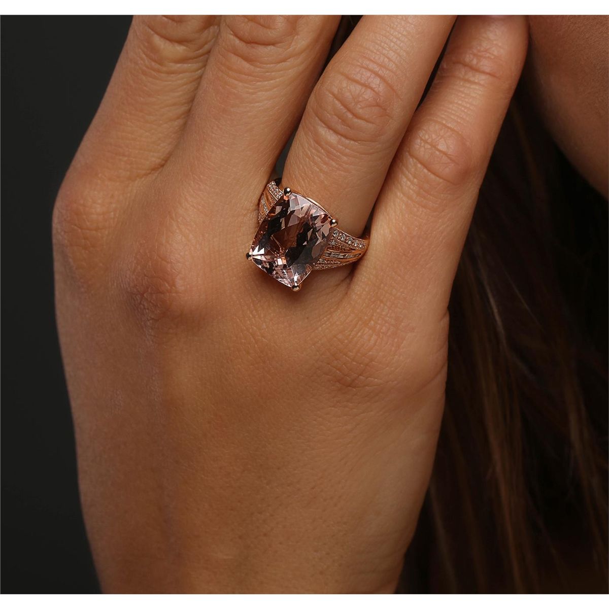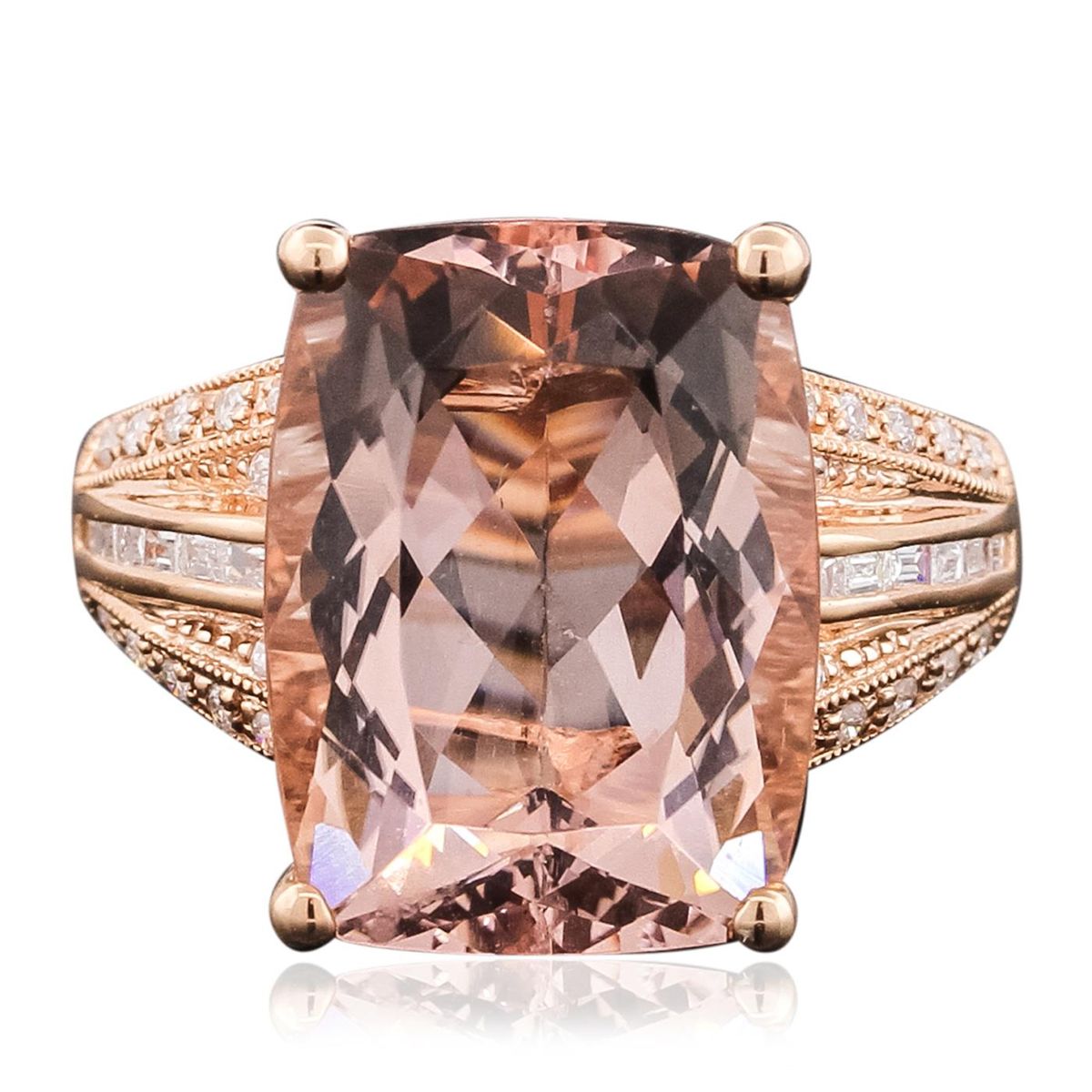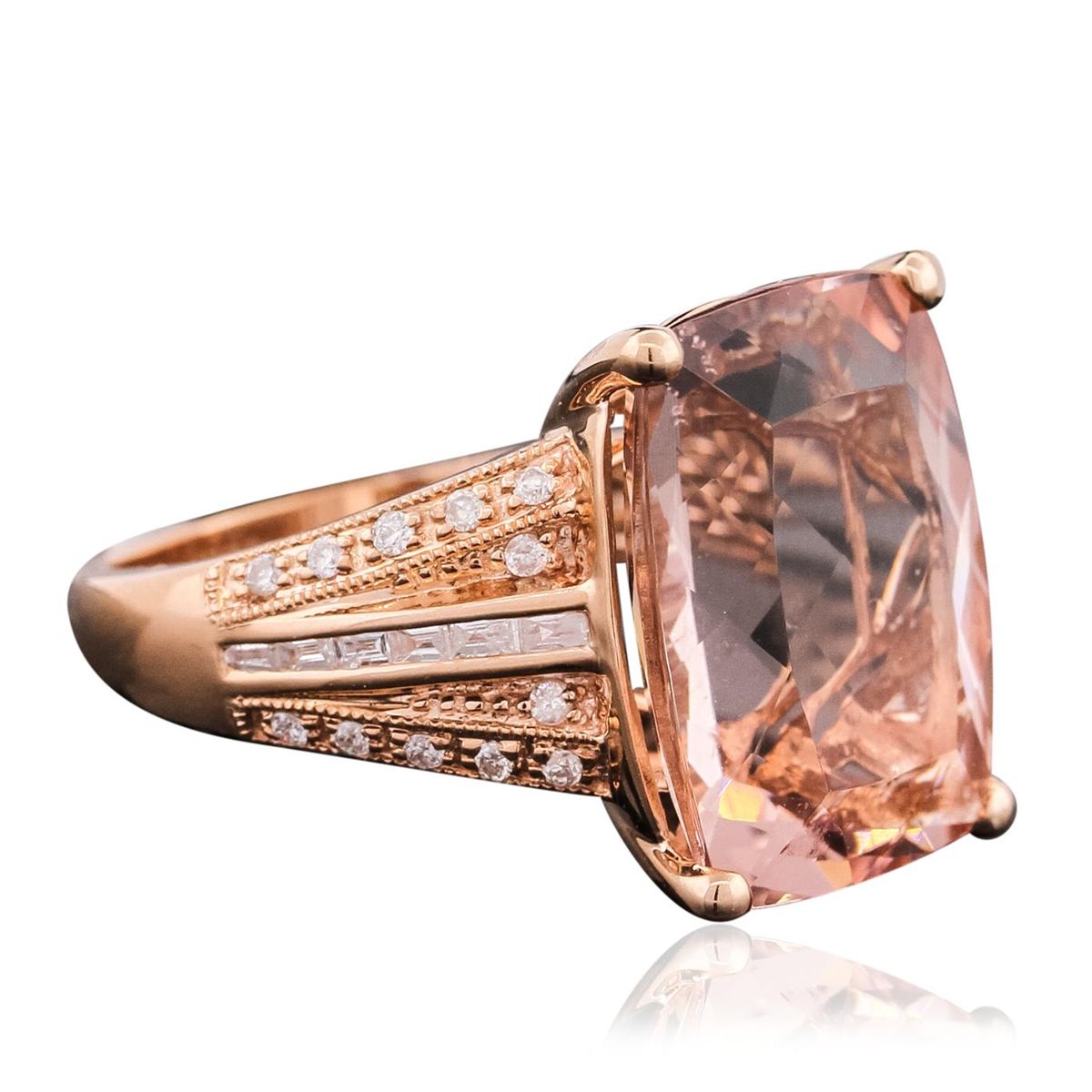 One ring featuring: 14KT rose gold weighing 4.21 grams containing one morganite with a total weight of 10.31ct, 12 baguette cut diamonds with a total weight of 0.15cts, and 24 round cut diamonds with a total weight of 0.16cts.