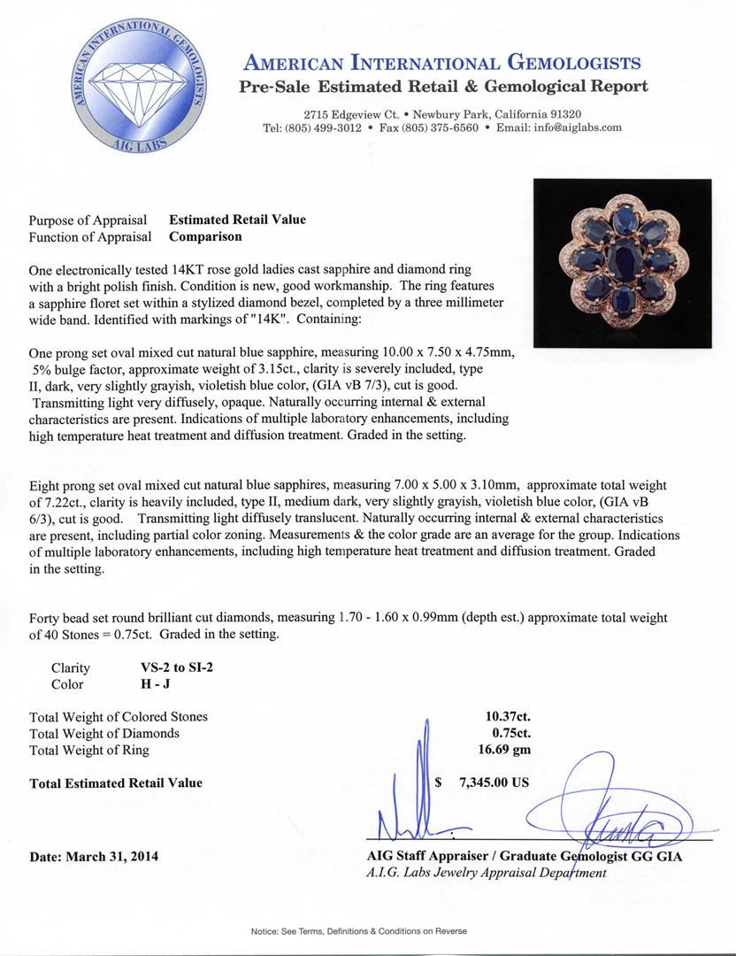One electronically tested 14KT rose gold ladies cast sapphire and diamond ring with a bright polish finish. Condition is new, good workmanship. The ring features a sapphire floret set within a stylized diamond bezel, completed by a three millimeter wide band. Identified with markings of "14K". Containing: One prong set oval mixed cut natural blue sapphire, measuring 10.00 x 7.50 x 4.75mm, 5%. bulge factor, approximate weight of 3.15ct., clarity is severely included, type II, dark, very slightly grayish, violetish blue color, (GIA vB 7/3), cut is good. Transmitting light very diffusely, opaque. Naturally occurring internal & external characteristics are present. Indications of multiple laboratory enhancements, including high temperature heat treatment and diffusion treatment. Graded in the setting. Eight prong set oval mixed cut natural blue sapphires, measuring 7.00 x 5.00 x 3.10mm, approximate. Total Weight of 7.22ct., clarity is heavily included, type II, medium dark, very slightly grayish, violetish blue color, (GIA vB 6/3), cut is good. Transmitting light diffusely translucent. Naturally occurring internal & external characteristics are present, including partial color zoning. Measurements & the color grade are an average for the group. Indications of multiple laboratory enhancements, including high temperature heat treatment and diffusion treatment. Graded in the setting. Forty bead set round brilliant cut diamonds, measuring 1.70 - 1.60 x 0.99mm (depth est.) approximate. Total Weight of 40 Stones = 0.75ct. Graded in the setting. Clarity: VS-2 to SI-2. Color: H - J. Total Weight of Colored Stones 10.37ct. Total Weight of Diamonds 0.75ct. Total Weight of Ring 16.69 grams. AIG Appraised.