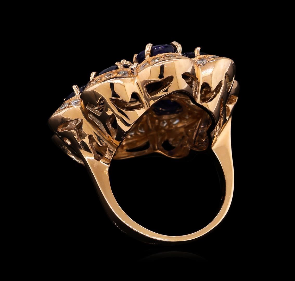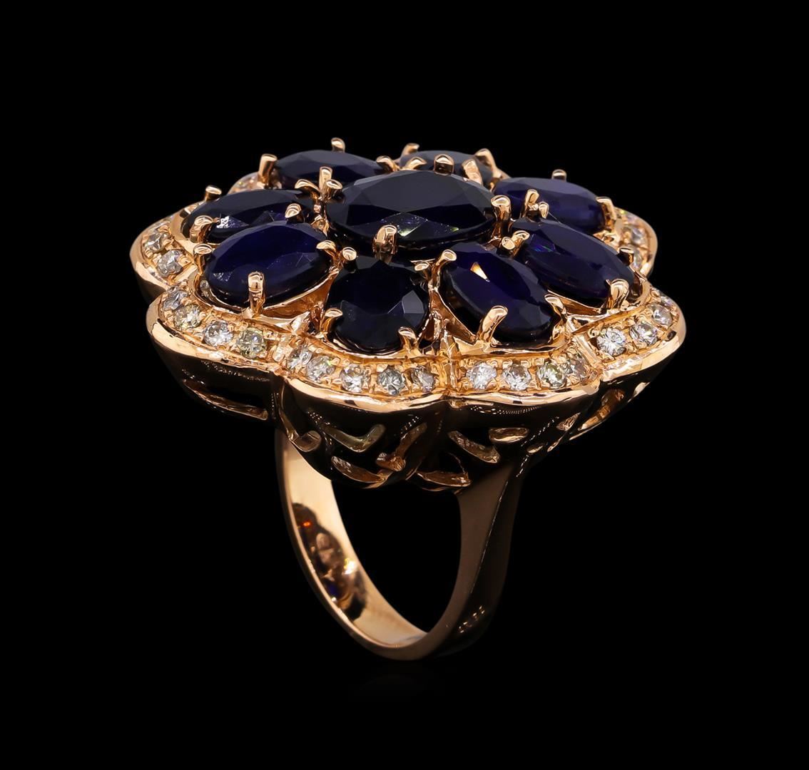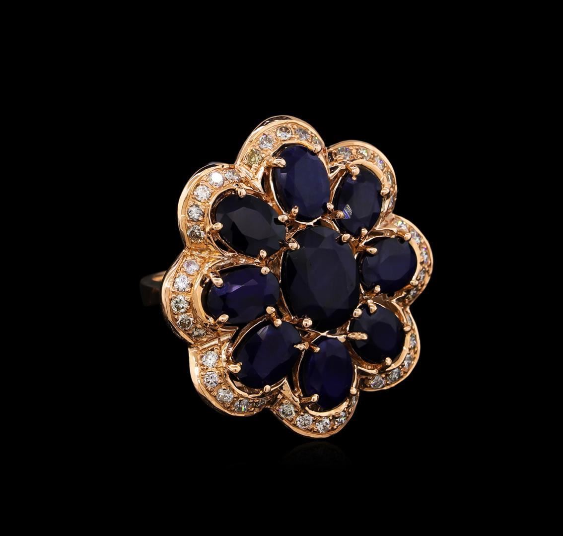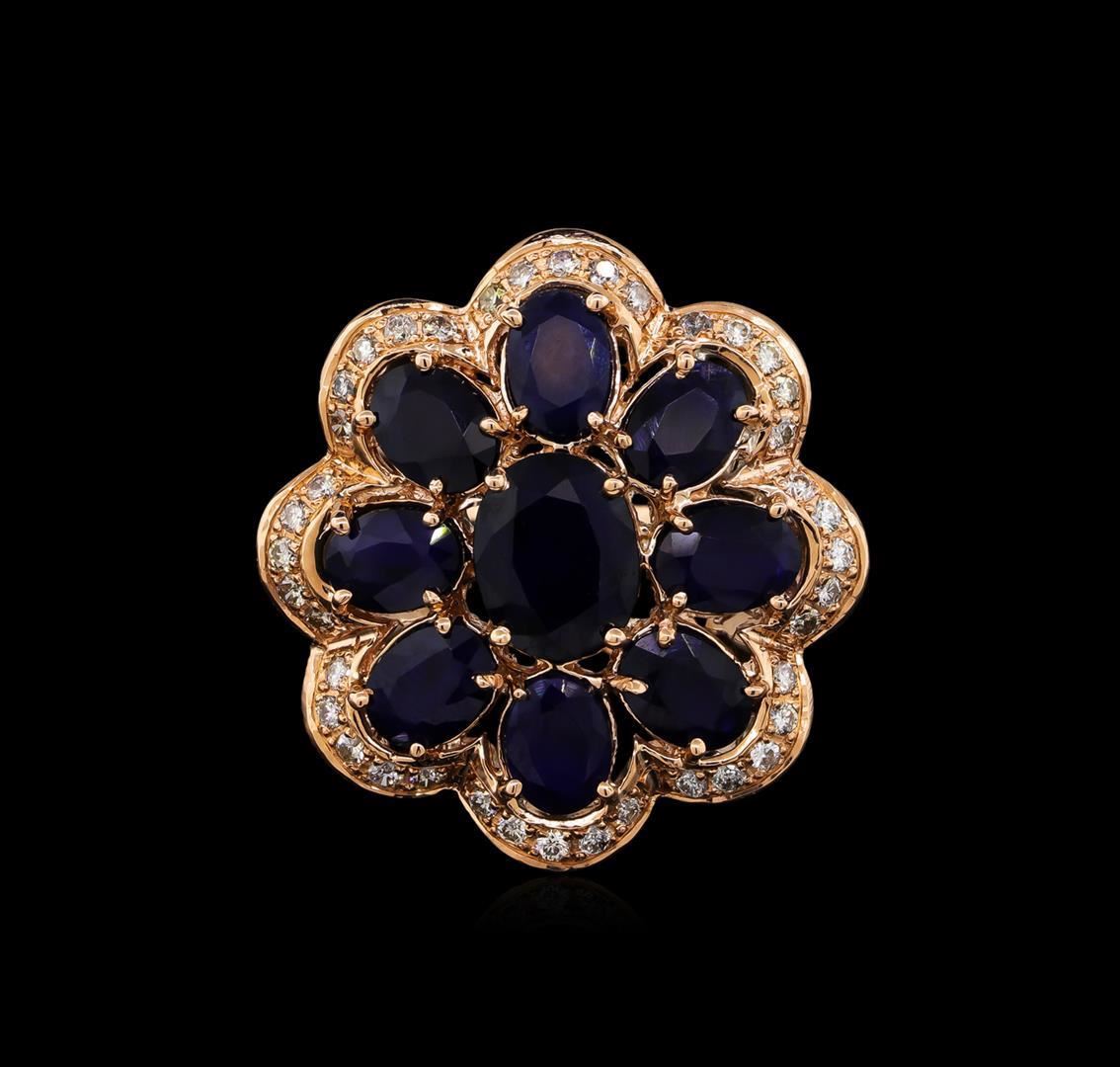 One electronically tested 14KT rose gold ladies cast sapphire and diamond ring with a bright polish finish. Condition is new, good workmanship. The ring features a sapphire floret set within a stylized diamond bezel, completed by a three millimeter wide band. Identified with markings of "14K". Containing: One prong set oval mixed cut natural blue sapphire, measuring 10.00 x 7.50 x 4.75mm, 5%. bulge factor, approximate weight of 3.15ct., clarity is severely included, type II, dark, very slightly grayish, violetish blue color, (GIA vB 7/3), cut is good. Transmitting light very diffusely, opaque. Naturally occurring internal & external characteristics are present. Indications of multiple laboratory enhancements, including high temperature heat treatment and diffusion treatment. Graded in the setting. Eight prong set oval mixed cut natural blue sapphires, measuring 7.00 x 5.00 x 3.10mm, approximate. Total Weight of 7.22ct., clarity is heavily included, type II, medium dark, very slightly grayish, violetish blue color, (GIA vB 6/3), cut is good. Transmitting light diffusely translucent. Naturally occurring internal & external characteristics are present, including partial color zoning. Measurements & the color grade are an average for the group. Indications of multiple laboratory enhancements, including high temperature heat treatment and diffusion treatment. Graded in the setting. Forty bead set round brilliant cut diamonds, measuring 1.70 - 1.60 x 0.99mm (depth est.) approximate. Total Weight of 40 Stones = 0.75ct. Graded in the setting. Clarity: VS-2 to SI-2. Color: H - J. Total Weight of Colored Stones 10.37ct. Total Weight of Diamonds 0.75ct. Total Weight of Ring 16.69 grams. AIG Appraised.