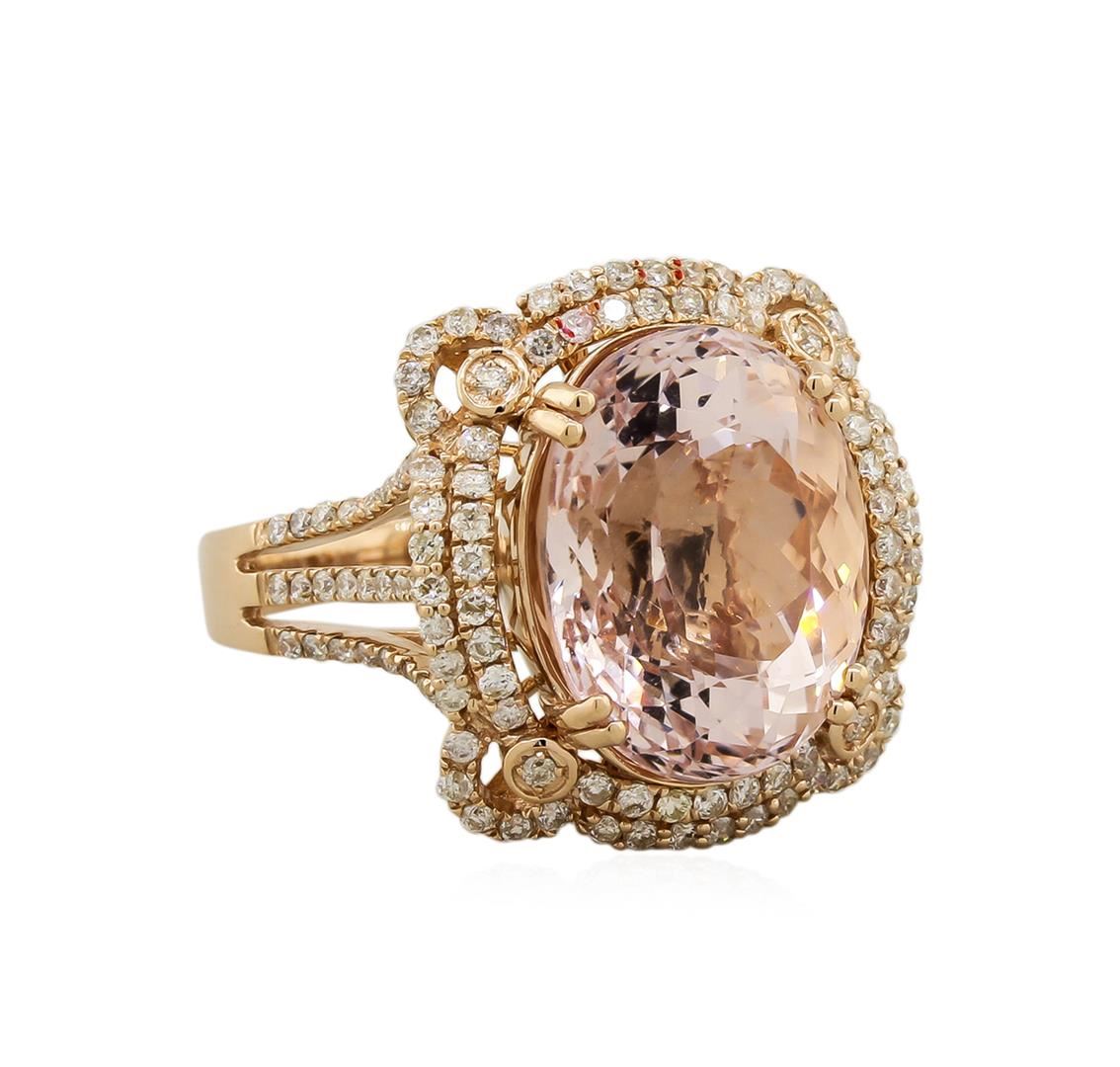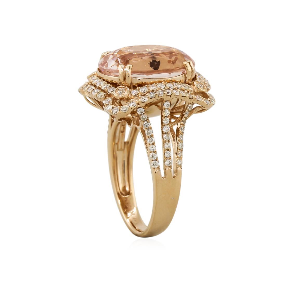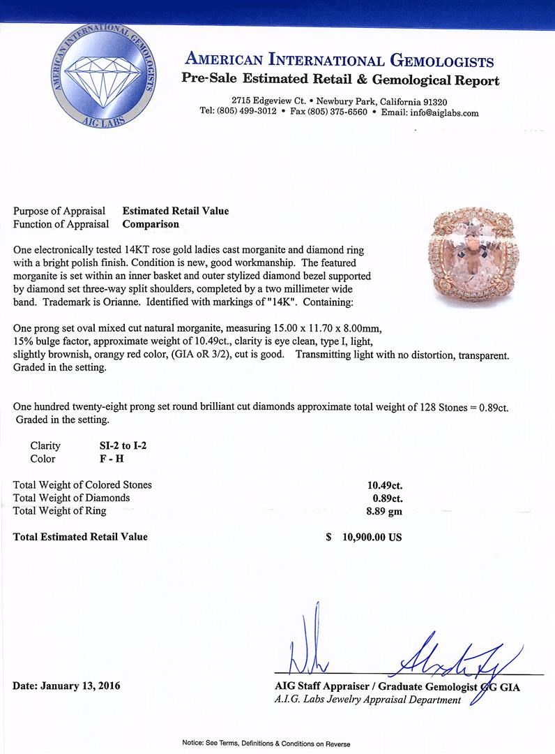 One electronically tested 14KT rose gold ladies cast morganite and diamond ring with a bright polish finish. The featured morganite is set within an inner basket and outer stylized diamond bezel supported by diamond set three-way split shoulders, completed by a two millimeter wide band. Trademark is Orianne. Identified with markings of "14K". Condition is new, good workmanship. Containing: One prong set oval mixed cut natural morganite, measuring 15.00 x 11.70 x 8.00mm, 15%. bulge factor, approximate weight of 10.49ct., clarity is eye clean, type I, light, slightly brownish, orangy red color, (GIA oR 3/2), cut is good. Transmitting light with no distortion, transparent. Graded in the setting.One Hundred Twenty-Eight prong set round brilliant cut diamonds approximate. Total Weight of 128 Stones = 0.89ct. Graded in the setting. Clarity: SI-2 to I-2. Color: F - H. Total Weight of Colored Stones 10.49ct. Total Weight of Diamonds 0.89ct. Total Weight of Ring 8.89gm. AIG Appraised at $10,900.00.