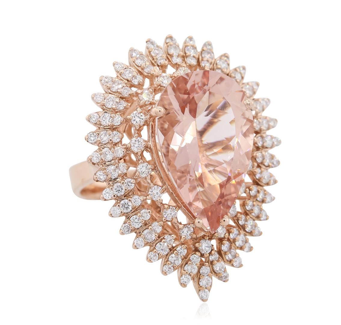 One electronically tested 14KT rose gold ladies combination cast & assembled morganite and diamond ring with a bright polish finish. Identified with markings of "K14". Condition is new. Containing: One prong set pear modified brilliant cut natural morganite, measuring 20.17 x 12.23 x 7.95mm, approximate weight of 10.67ct., clarity is eye clean, type I, very light, very slightly brownish, reddish orange color, (GIA rO 2/3), cut is good. One Hundred Twenty prong set round brilliant cut diamonds, measuring 1.50 - 1.20 x 0.81mm (depth est.) approximate total weight of 120 Stones = 1.08ct. Clarity: SI-2 to I-1. Color: I - J, Cut is Good. Colored gemstones are presumed to have been subjected to commonly used enhancement processes. All diamonds and colored gemstones are graded in the mounting, unless otherwise stated. Total Weight of Colored Stones 10.67ct. Total Weight of Diamonds 1.08ct. Total Weight of Ring 14.00 grams. GGL Appraised at $9,965.00.