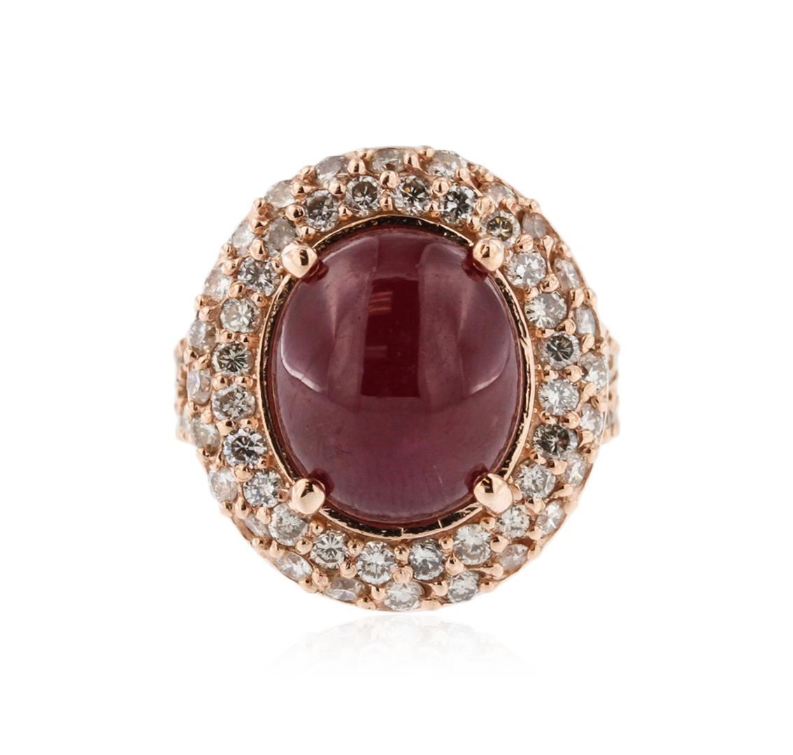 One electronically tested 14KT rose gold ladies cast ruby and diamond ring with a bright polish finish. Identified with markings of "14K". Condition is new. Containing: One prong set oval cabochon cut natural ruby, measuring 13.20 x 11.00 x 6.82mm, approximate weight of 10.69ct., clarity is heavily included, type II, medium dark, moderately strong, strongly purplish red color, (GIA stpR 6/4), cut is good. Sixty-Four prong set round brilliant cut diamonds, measuring 1.70 - 1.60 x 0.99mm (depth est.) approximate total weight of 64 Stones = 1.05ct. Clarity: SI-1 to I-1. Color: K - L, Cut is Good. Colored gemstones are presumed to have been subjected to commonly used enhancement processes, All diamonds and colored gemstones are graded in the mounting, unless otherwise stated. Total Weight of Colored Stones 10.69ct. Total Weight of Diamonds 1.05ct. Total Weight of Ring 12.90 grams. GGL Appraised at $6,360.00.