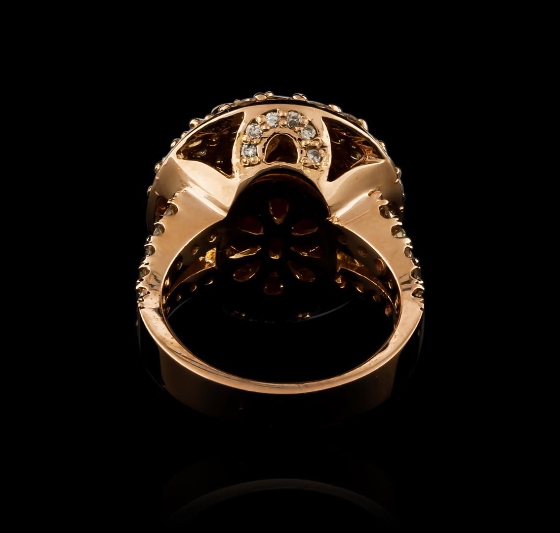 One electronically tested 14KT rose gold ladies cast ruby and diamond ring with a bright polish finish. Identified with markings of "14K". Condition is new. Containing: One prong set oval cabochon cut natural ruby, measuring 13.20 x 11.00 x 6.82mm, approximate weight of 10.69ct., clarity is heavily included, type II, medium dark, moderately strong, strongly purplish red color, (GIA stpR 6/4), cut is good. Sixty-Four prong set round brilliant cut diamonds, measuring 1.70 - 1.60 x 0.99mm (depth est.) approximate total weight of 64 Stones = 1.05ct. Clarity: SI-1 to I-1. Color: K - L, Cut is Good. Colored gemstones are presumed to have been subjected to commonly used enhancement processes, All diamonds and colored gemstones are graded in the mounting, unless otherwise stated. Total Weight of Colored Stones 10.69ct. Total Weight of Diamonds 1.05ct. Total Weight of Ring 12.90 grams. GGL Appraised at $6,360.00.