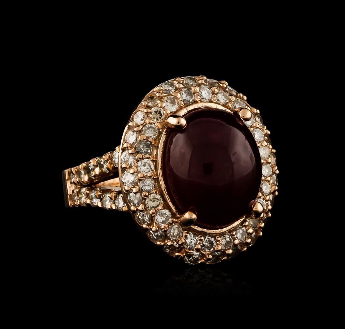 One electronically tested 14KT rose gold ladies cast ruby and diamond ring with a bright polish finish. Identified with markings of "14K". Condition is new. Containing: One prong set oval cabochon cut natural ruby, measuring 13.20 x 11.00 x 6.82mm, approximate weight of 10.69ct., clarity is heavily included, type II, medium dark, moderately strong, strongly purplish red color, (GIA stpR 6/4), cut is good. Sixty-Four prong set round brilliant cut diamonds, measuring 1.70 - 1.60 x 0.99mm (depth est.) approximate total weight of 64 Stones = 1.05ct. Clarity: SI-1 to I-1. Color: K - L, Cut is Good. Colored gemstones are presumed to have been subjected to commonly used enhancement processes, All diamonds and colored gemstones are graded in the mounting, unless otherwise stated. Total Weight of Colored Stones 10.69ct. Total Weight of Diamonds 1.05ct. Total Weight of Ring 12.90 grams. GGL Appraised at $6,360.00.