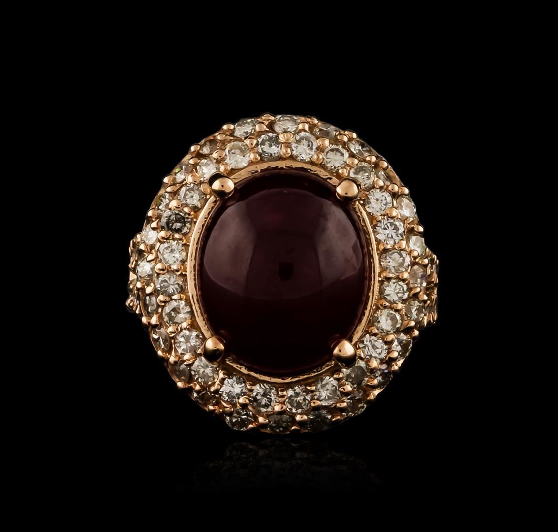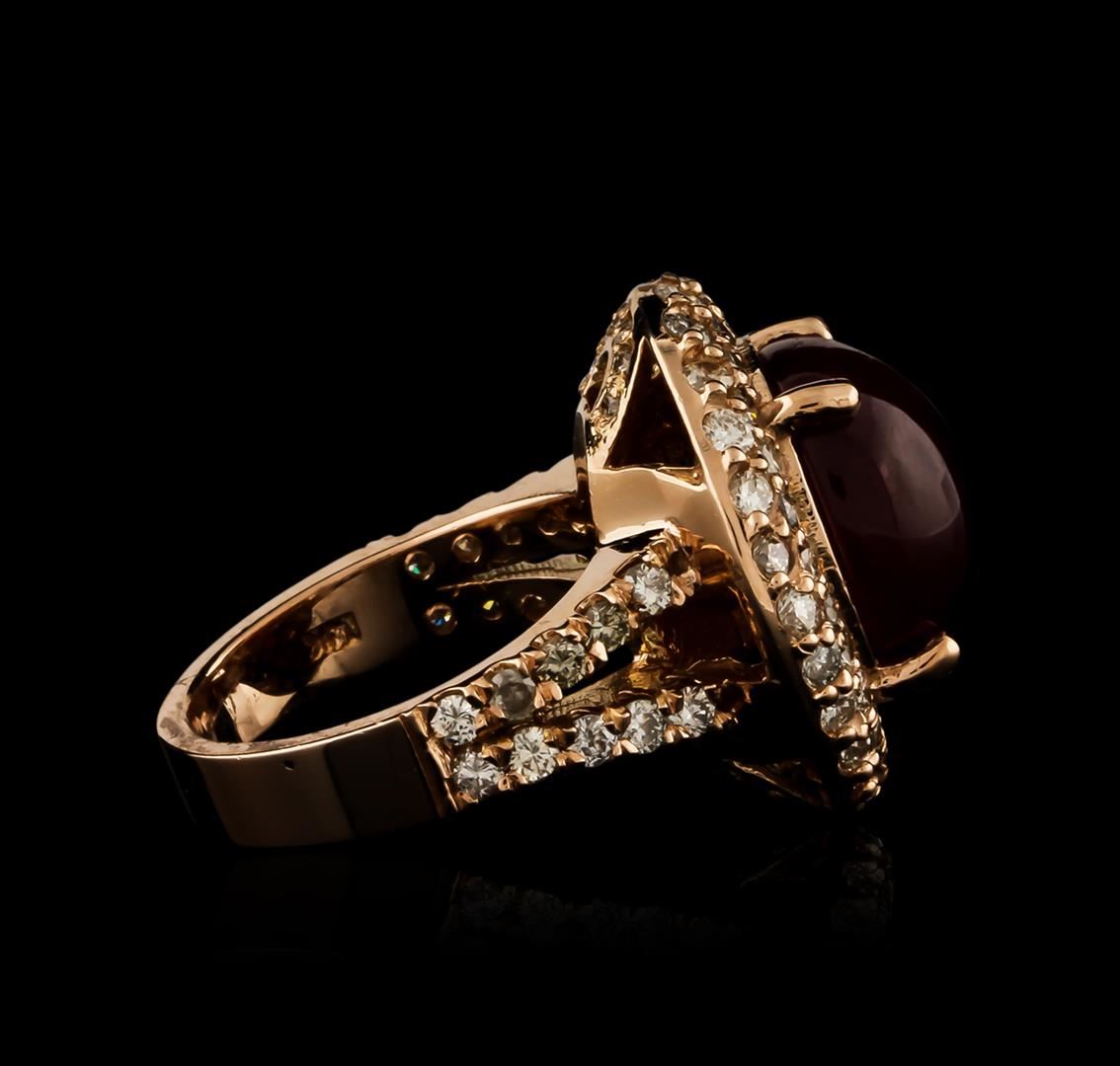 One electronically tested 14KT rose gold ladies cast ruby and diamond ring with a bright polish finish. Identified with markings of "14K". Condition is new. Containing: One prong set oval cabochon cut natural ruby, measuring 13.20 x 11.00 x 6.82mm, approximate weight of 10.69ct., clarity is heavily included, type II, medium dark, moderately strong, strongly purplish red color, (GIA stpR 6/4), cut is good. Sixty-Four prong set round brilliant cut diamonds, measuring 1.70 - 1.60 x 0.99mm (depth est.) approximate total weight of 64 Stones = 1.05ct. Clarity: SI-1 to I-1. Color: K - L, Cut is Good. Colored gemstones are presumed to have been subjected to commonly used enhancement processes, All diamonds and colored gemstones are graded in the mounting, unless otherwise stated. Total Weight of Colored Stones 10.69ct. Total Weight of Diamonds 1.05ct. Total Weight of Ring 12.90 grams. GGL Appraised at $6,360.00.