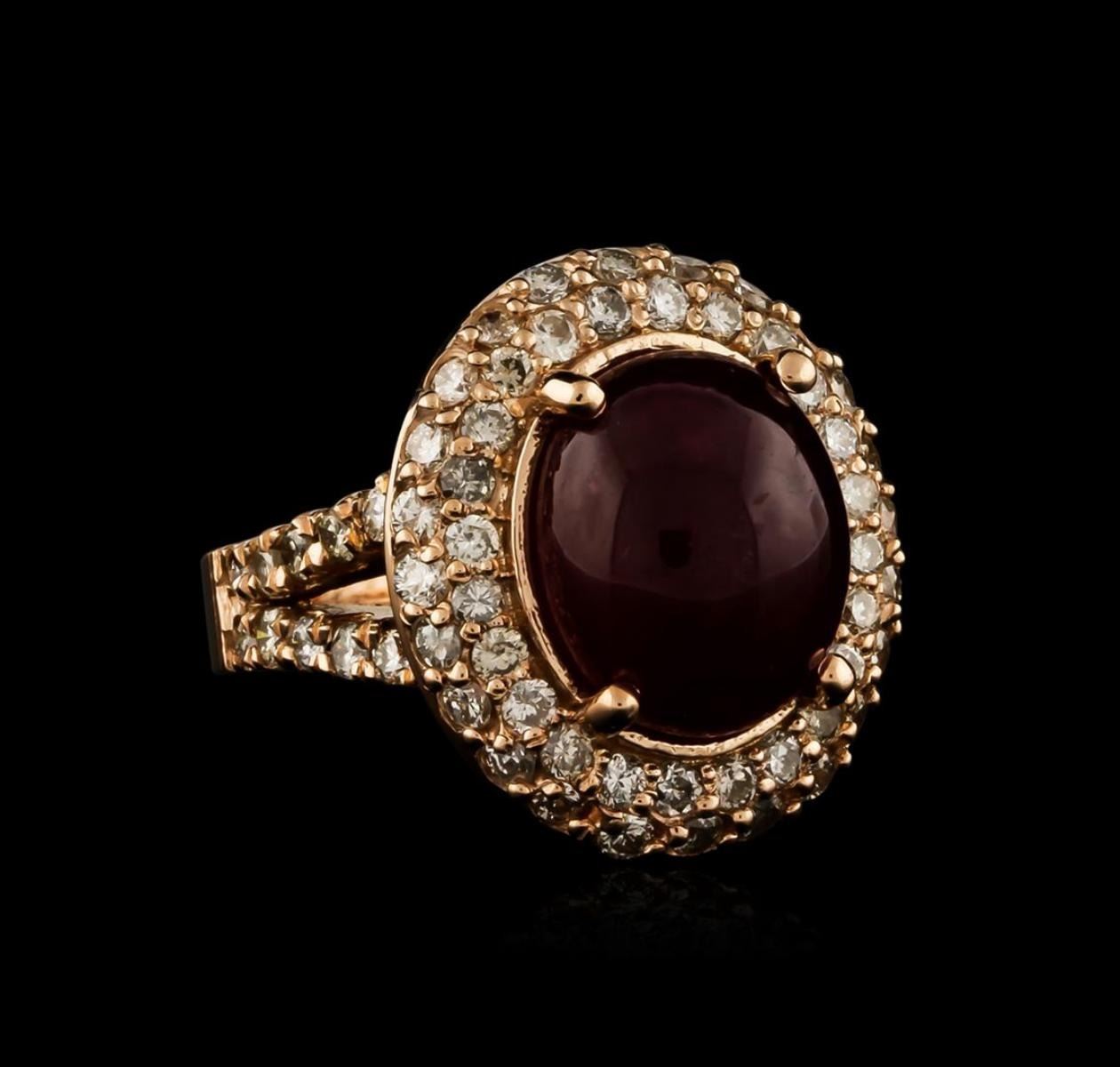 One electronically tested 14KT rose gold ladies cast ruby and diamond ring with a bright polish finish. Identified with markings of "14K". Condition is new. Containing: One prong set oval cabochon cut natural ruby, measuring 13.20 x 11.00 x 6.82mm, approximate weight of 10.69ct., clarity is heavily included, type II, medium dark, moderately strong, strongly purplish red color, (GIA stpR 6/4), cut is good. Sixty-Four prong set round brilliant cut diamonds, measuring 1.70 - 1.60 x 0.99mm (depth est.) approximate total weight of 64 Stones = 1.05ct. Clarity: SI-1 to I-1. Color: K - L, Cut is Good. Colored gemstones are presumed to have been subjected to commonly used enhancement processes, All diamonds and colored gemstones are graded in the mounting, unless otherwise stated. Total Weight of Colored Stones 10.69ct. Total Weight of Diamonds 1.05ct. Total Weight of Ring 12.90 grams. GGL Appraised.