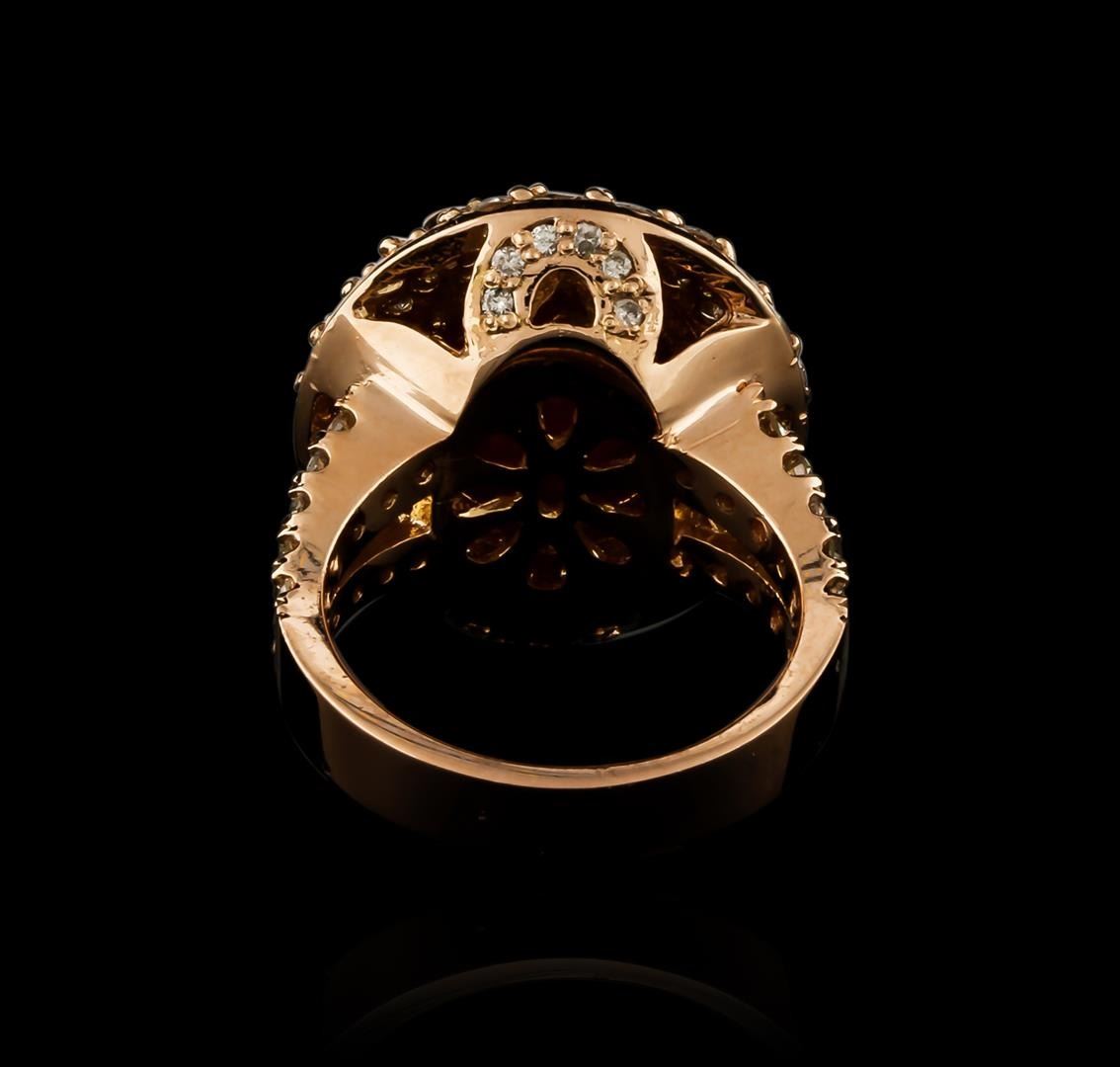 One electronically tested 14KT rose gold ladies cast ruby and diamond ring with a bright polish finish. Identified with markings of "14K". Condition is new. Containing: One prong set oval cabochon cut natural ruby, measuring 13.20 x 11.00 x 6.82mm, approximate weight of 10.69ct., clarity is heavily included, type II, medium dark, moderately strong, strongly purplish red color, (GIA stpR 6/4), cut is good. Sixty-Four prong set round brilliant cut diamonds, measuring 1.70 - 1.60 x 0.99mm (depth est.) approximate total weight of 64 Stones = 1.05ct. Clarity: SI-1 to I-1. Color: K - L, Cut is Good. Colored gemstones are presumed to have been subjected to commonly used enhancement processes, All diamonds and colored gemstones are graded in the mounting, unless otherwise stated. Total Weight of Colored Stones 10.69ct. Total Weight of Diamonds 1.05ct. Total Weight of Ring 12.90 grams. GGL Appraised.