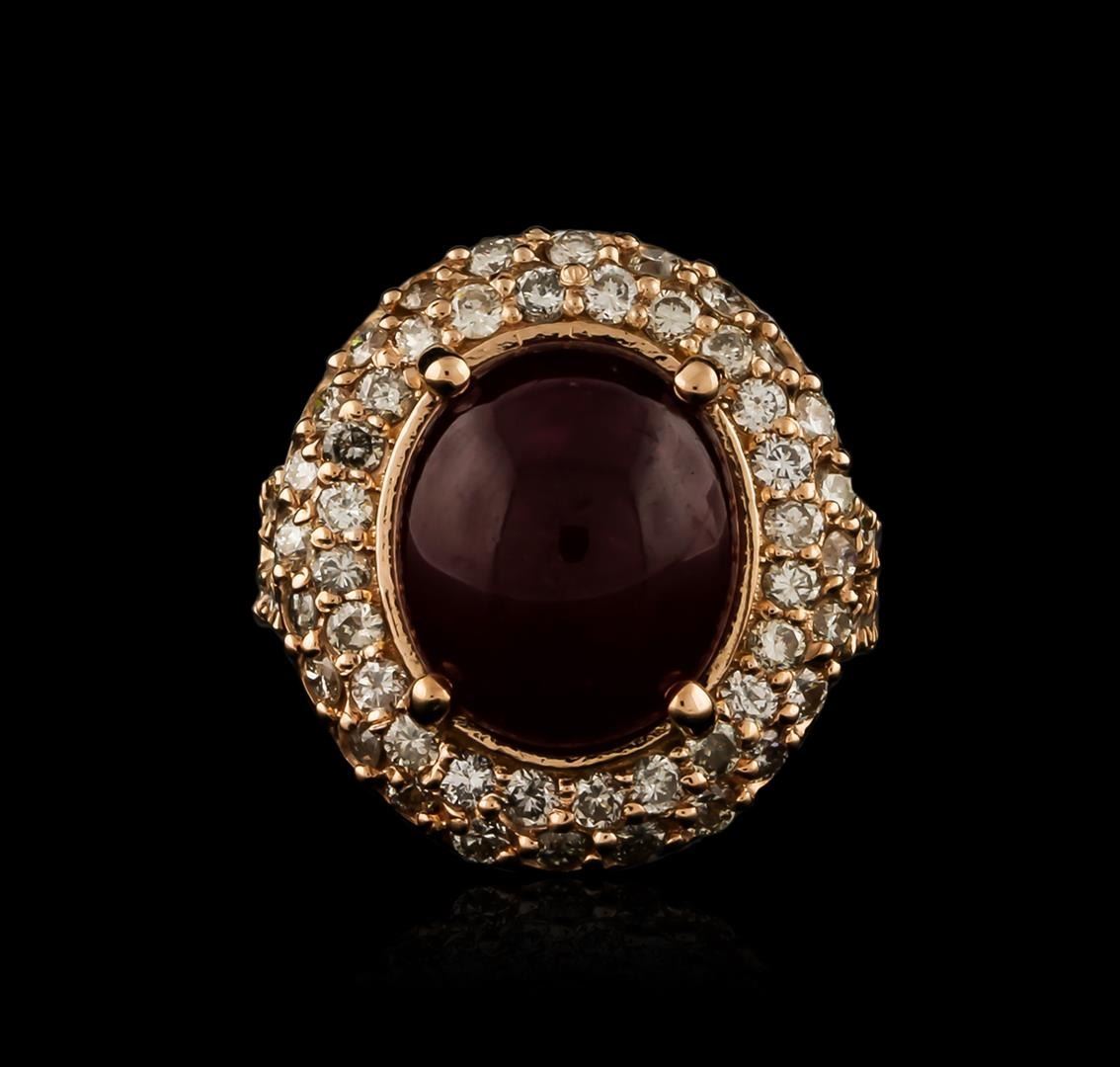 One electronically tested 14KT rose gold ladies cast ruby and diamond ring with a bright polish finish. Identified with markings of "14K". Condition is new. Containing: One prong set oval cabochon cut natural ruby, measuring 13.20 x 11.00 x 6.82mm, approximate weight of 10.69ct., clarity is heavily included, type II, medium dark, moderately strong, strongly purplish red color, (GIA stpR 6/4), cut is good. Sixty-Four prong set round brilliant cut diamonds, measuring 1.70 - 1.60 x 0.99mm (depth est.) approximate total weight of 64 Stones = 1.05ct. Clarity: SI-1 to I-1. Color: K - L, Cut is Good. Colored gemstones are presumed to have been subjected to commonly used enhancement processes, All diamonds and colored gemstones are graded in the mounting, unless otherwise stated. Total Weight of Colored Stones 10.69ct. Total Weight of Diamonds 1.05ct. Total Weight of Ring 12.90 grams. GGL Appraised.