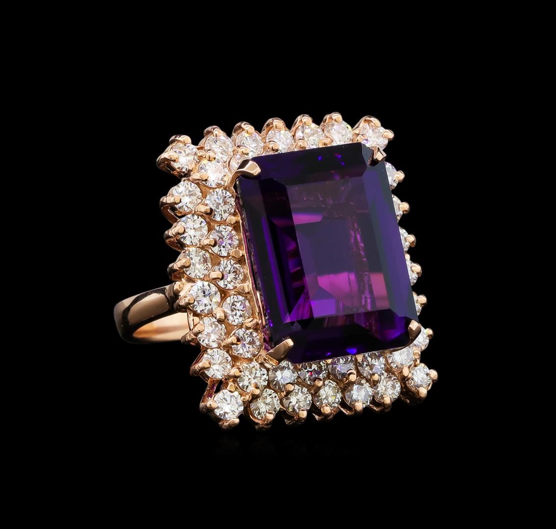 One electronically tested 14KT rose gold ladies cast amethyst and diamond ring with a bright polish finish. Identified with markings of "14K". Condition is new. Containing: One prong set emerald standard step cut natural amethyst, measuring 16.00 x 12.00 x 7.80mm, approximate weight of 10.76ct., clarity is eye clean, type II, medium, moderately strong, purple color, (GIA P 5/4), cut is good. Forty-Eight prong set round brilliant cut diamonds, measuring 2.40 - 2.30 x 1.41mm (depth est.) approximate total weight of 48 Stones = 2.39ct. Clarity: VS-2 to SI-1. Color: I - J, Cut is Good. Colored gemstones are presumed to have been subjected to commonly used enhancement processes. All diamonds and colored gemstones are graded in the mounting, unless otherwise stated. Total Weight of Colored Stones 10.76ct. Total Weight of Diamonds 2.39ct. Total Weight of Ring 11.50 grams. GGL Appraised at $5,150.00.