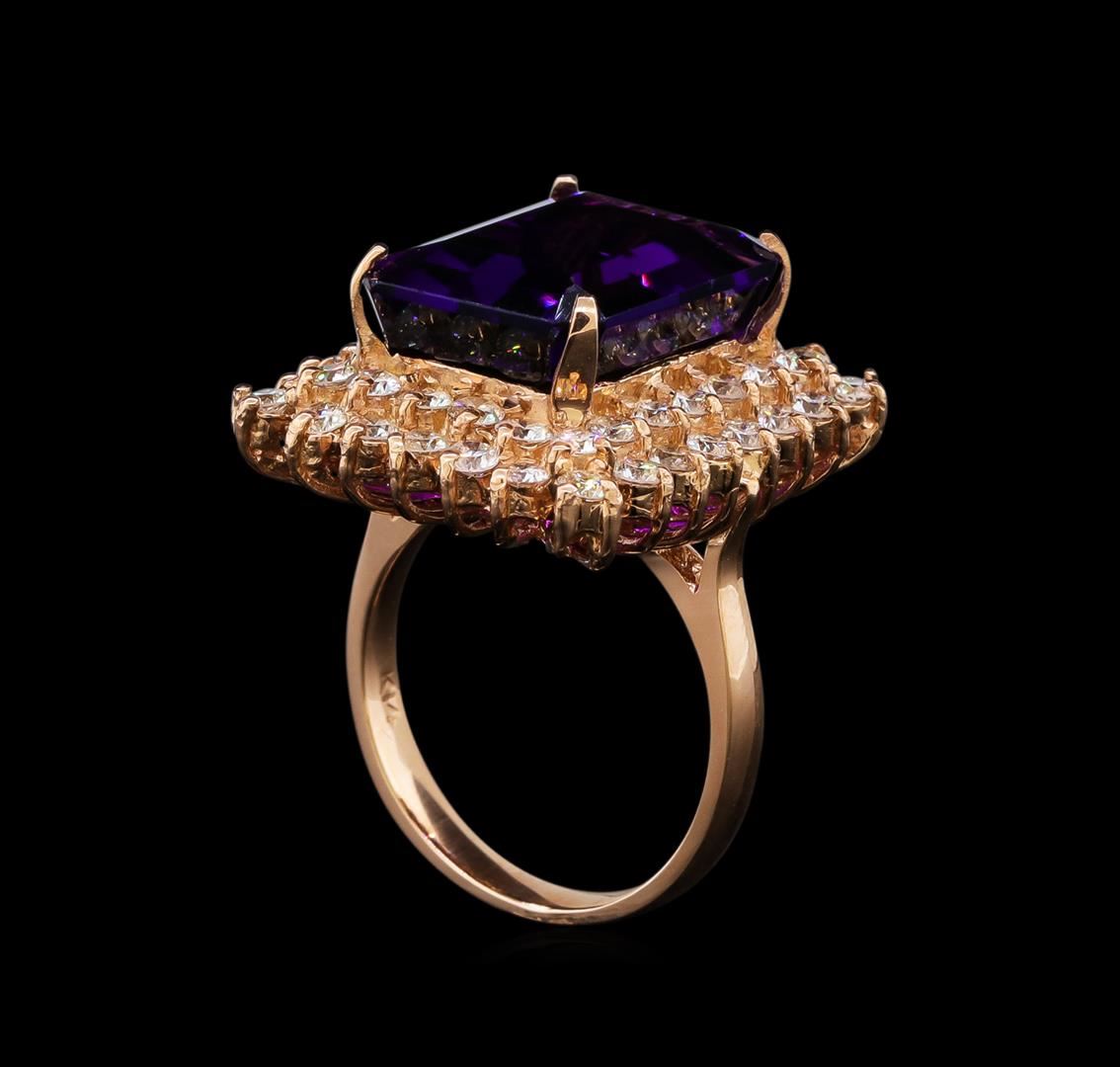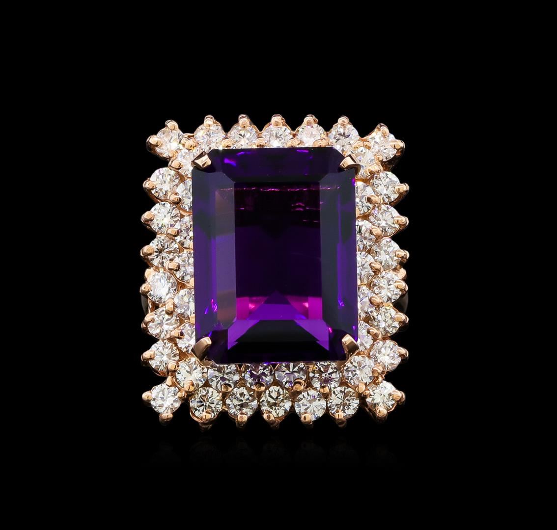One electronically tested 14KT rose gold ladies cast amethyst and diamond ring with a bright polish finish. Identified with markings of "14K". Condition is new. Containing: One prong set emerald standard step cut natural amethyst, measuring 16.00 x 12.00 x 7.80mm, approximate weight of 10.76ct., clarity is eye clean, type II, medium, moderately strong, purple color, (GIA P 5/4), cut is good. Forty-Eight prong set round brilliant cut diamonds, measuring 2.40 - 2.30 x 1.41mm (depth est.) approximate total weight of 48 Stones = 2.39ct. Clarity: VS-2 to SI-1. Color: I - J, Cut is Good. Colored gemstones are presumed to have been subjected to commonly used enhancement processes. All diamonds and colored gemstones are graded in the mounting, unless otherwise stated. Total Weight of Colored Stones 10.76ct. Total Weight of Diamonds 2.39ct. Total Weight of Ring 11.50 grams. GGL Appraised at $5,150.00.