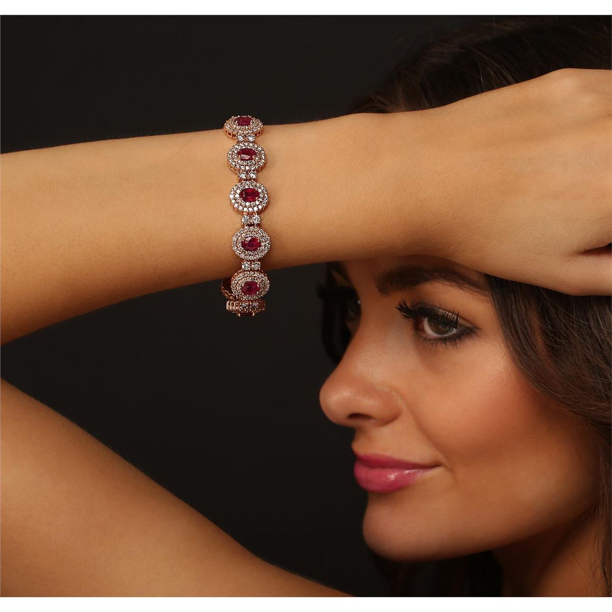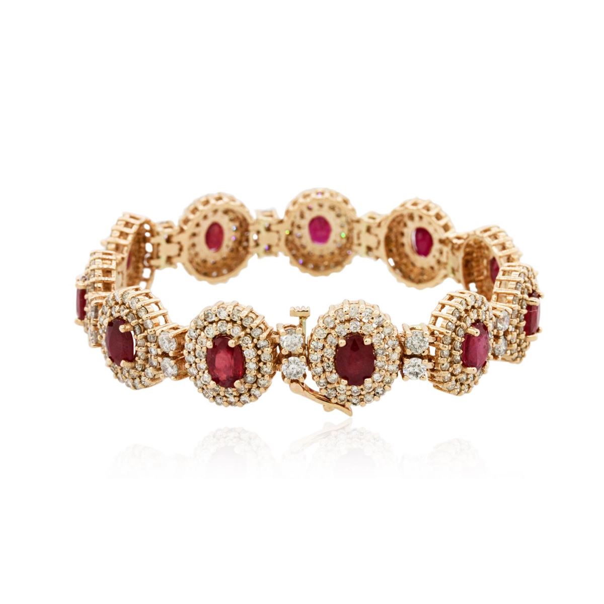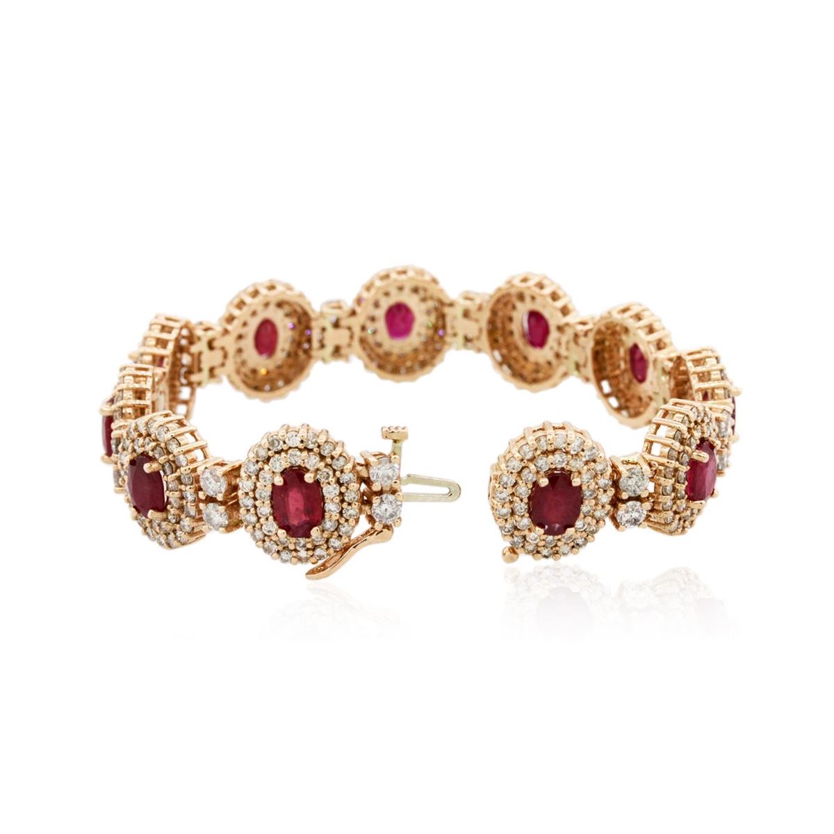 One electronically tested 14KT rose gold ladies cast & assembled ruby and diamond bracelet with a bright polish finish. Condition is new, good workmanship. Seven inch length bracelet features a ribbon of ruby and diamond bezels, alternated by diamond duos, terminating in a concealed clasp with safety clasp. Identified with markings of "14K". Containing: Eleven prong set oval mixed cut natural rubies, measuring 7.00 x 5.00 x 3.25mm, 6%. bulge factor, approximate. Total Weight of 10.89ct., clarity is heavily included, type II, medium dark, moderately strong, slightly purplish red color, (GIA slpR 6/4), cut is good. Transmitting light somewhat diffusely, transparent to translucent. Naturally occurring internal & external characteristics are present. Indications of laboratory high temperature heat treatment, with glass & flux additives. Measurements & the color grade are an average for the group. Graded in the setting. Ruby has a low tolerance to rhodium plating, repolishing the surface, & ultrasonic cleaning. Twenty-Two prong set round brilliant cut diamonds, measuring 3.20 - 3.10 x 1.89mm (depth est.) approximate. Total Weight of 22 Stones = 2.61ct. Graded in the setting. Clarity: I-1 to I-2. Color: H - J Three Hundred Seventy-Four prong set round brilliant cut diamonds, measuring 1.80 - 1.60 x 1.02mm (depth est.) approximate. Total Weight of 374 Stones = 6.79ct. Graded in the setting. Clarity: SI-2 to I-2. Color: K - M. Total Weight of Colored Stones 10.89ct. Total Weight of Diamonds 9.40ct. Total Weight of Bracelet 39.70 grams. AIG Appraised at $26,455.00.