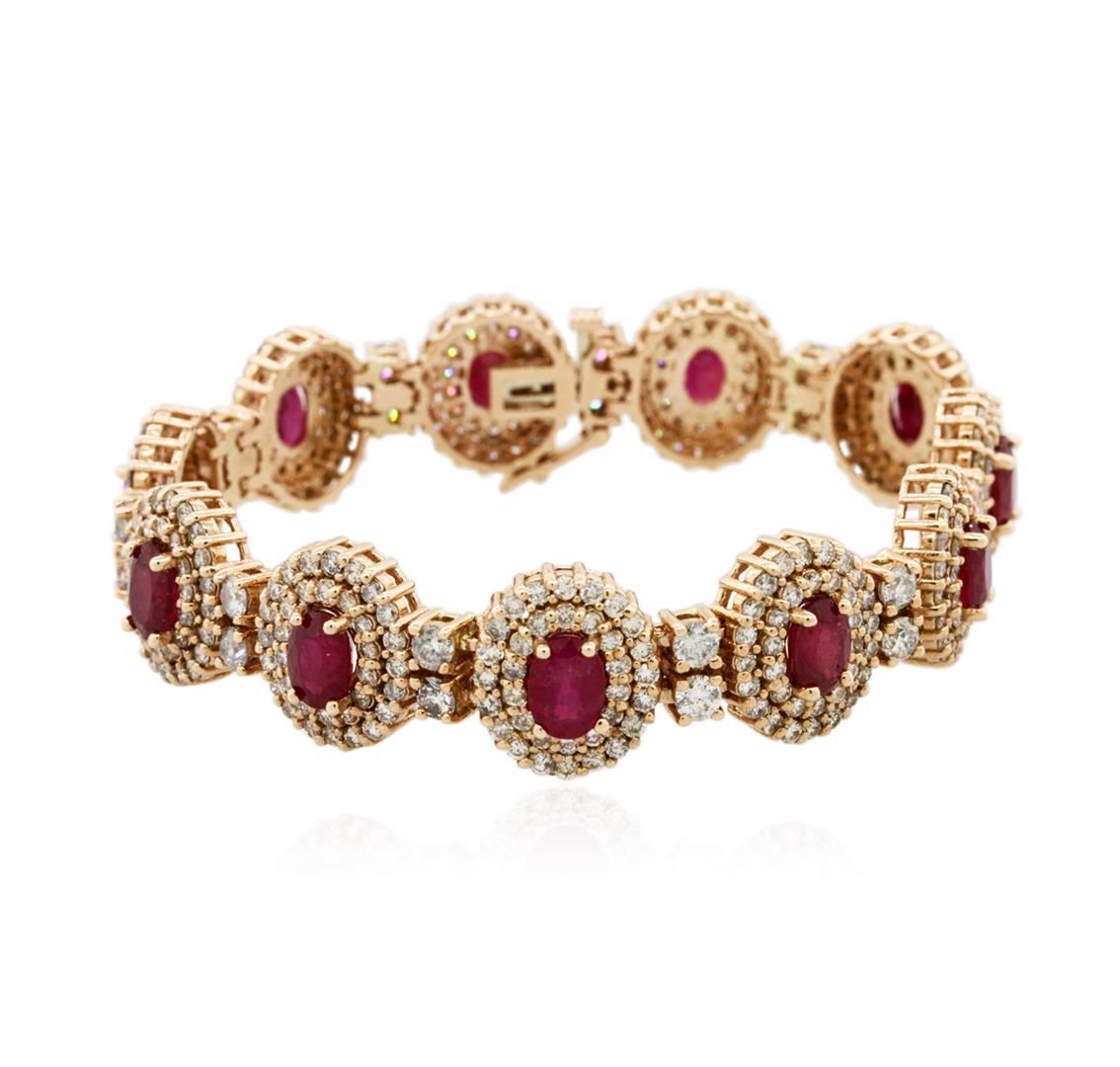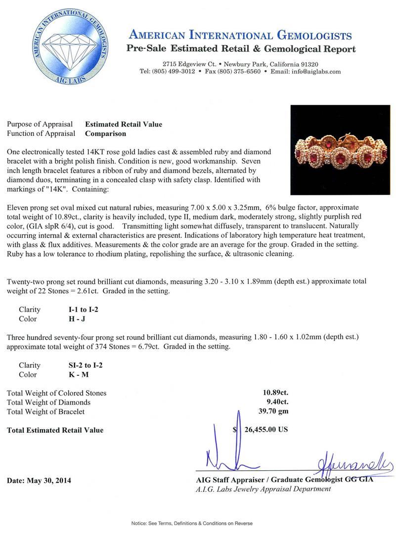 One electronically tested 14KT rose gold ladies cast & assembled ruby and diamond bracelet with a bright polish finish. Condition is new, good workmanship. Seven inch length bracelet features a ribbon of ruby and diamond bezels, alternated by diamond duos, terminating in a concealed clasp with safety clasp. Identified with markings of "14K". Containing: Eleven prong set oval mixed cut natural rubies, measuring 7.00 x 5.00 x 3.25mm, 6%. bulge factor, approximate. Total Weight of 10.89ct., clarity is heavily included, type II, medium dark, moderately strong, slightly purplish red color, (GIA slpR 6/4), cut is good. Transmitting light somewhat diffusely, transparent to translucent. Naturally occurring internal & external characteristics are present. Indications of laboratory high temperature heat treatment, with glass & flux additives. Measurements & the color grade are an average for the group. Graded in the setting. Ruby has a low tolerance to rhodium plating, repolishing the surface, & ultrasonic cleaning. Twenty-Two prong set round brilliant cut diamonds, measuring 3.20 - 3.10 x 1.89mm (depth est.) approximate. Total Weight of 22 Stones = 2.61ct. Graded in the setting. Clarity: I-1 to I-2. Color: H - J Three Hundred Seventy-Four prong set round brilliant cut diamonds, measuring 1.80 - 1.60 x 1.02mm (depth est.) approximate. Total Weight of 374 Stones = 6.79ct. Graded in the setting. Clarity: SI-2 to I-2. Color: K - M. Total Weight of Colored Stones 10.89ct. Total Weight of Diamonds 9.40ct. Total Weight of Bracelet 39.70 grams. AIG Appraised at $26,455.00.