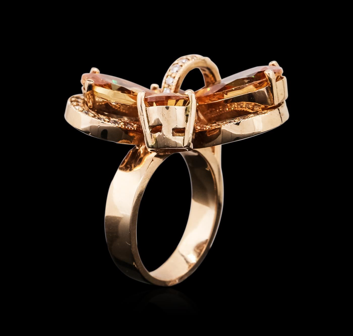 One electronically tested 14KT rose gold ladies cast citrine and diamond ring with a bright polish finish. Condition is new. Containing: Two prong set pear modified brilliant cut natural citrine quartzs, measuring 13.00 x 9.00 x 5.85mm, approximate total weight of 7.28ct., clarity is eye clean, type I, light, slightly brownish, orangy yellow color, (GIA oY 3/2), cut is good. One prong set pear modified brilliant cut natural citrine quartz, measuring 11.00 x 7.97 x 5.18mm, approximate weight of 2.42ct., clarity is eye clean, type I, light, slightly brownish, orangy yellow color, (GIA oY 3/2), cut is good. One prong set pear modified brilliant cut natural citrine quartz, measuring 9.00 x 7.00 x 4.55mm, approximate weight of 1.52ct., clarity is eye clean, type I, light, slightly brownish, orangy yellow color, (GIA oY 3/2), cut is good. Forty-Six prong set round brilliant cut diamonds, measuring 1.50 - 1.50 x 0.90mm (depth est.) approximate total weight of 46 Stones = 0.57ct. Clarity: SI-1 to SI-2. Color: J - K, Cut is Good. Colored gemstones are presumed to have been subjected to commonly used enhancement processes. All diamonds and colored gemstones are graded in the mounting, unless otherwise stated. Total Weight of Colored Stones 11.22ct. Total Weight of Diamonds 0.57ct. Total Weight of Ring 18.30 grams. GGL Appraised at $4,890.00.