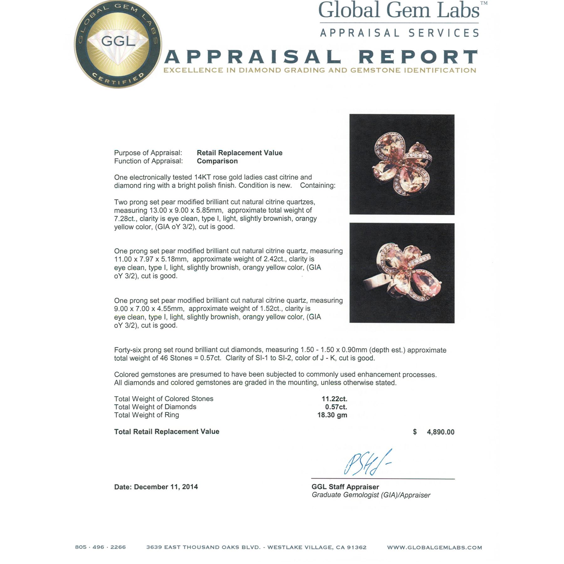 One electronically tested 14KT rose gold ladies cast citrine and diamond ring with a bright polish finish. Condition is new. Containing: Two prong set pear modified brilliant cut natural citrine quartzs, measuring 13.00 x 9.00 x 5.85mm, approximate total weight of 7.28ct., clarity is eye clean, type I, light, slightly brownish, orangy yellow color, (GIA oY 3/2), cut is good. One prong set pear modified brilliant cut natural citrine quartz, measuring 11.00 x 7.97 x 5.18mm, approximate weight of 2.42ct., clarity is eye clean, type I, light, slightly brownish, orangy yellow color, (GIA oY 3/2), cut is good. One prong set pear modified brilliant cut natural citrine quartz, measuring 9.00 x 7.00 x 4.55mm, approximate weight of 1.52ct., clarity is eye clean, type I, light, slightly brownish, orangy yellow color, (GIA oY 3/2), cut is good. Forty-Six prong set round brilliant cut diamonds, measuring 1.50 - 1.50 x 0.90mm (depth est.) approximate total weight of 46 Stones = 0.57ct. Clarity: SI-1 to SI-2. Color: J - K, Cut is Good. Colored gemstones are presumed to have been subjected to commonly used enhancement processes. All diamonds and colored gemstones are graded in the mounting, unless otherwise stated. Total Weight of Colored Stones 11.22ct. Total Weight of Diamonds 0.57ct. Total Weight of Ring 18.30 grams. GGL Appraised at $4,890.00.