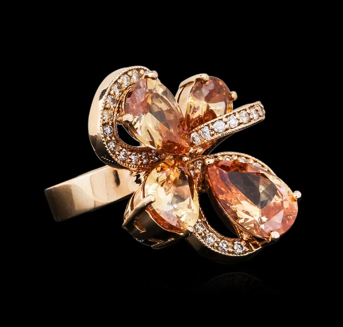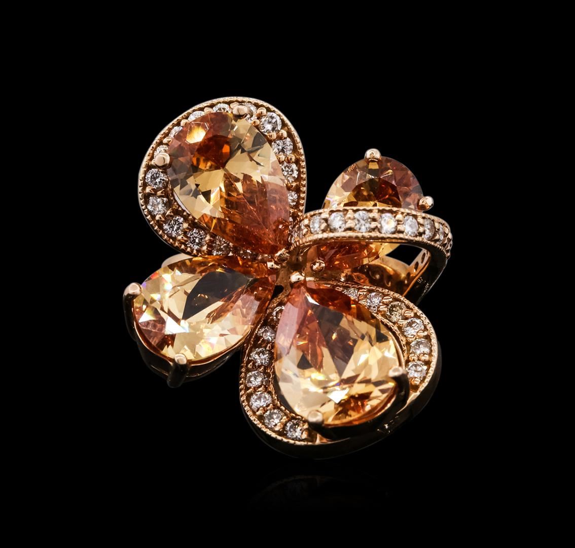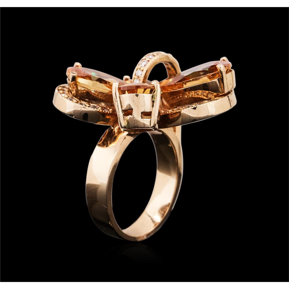One electronically tested 14KT rose gold ladies cast citrine and diamond ring with a bright polish finish. Condition is new. Containing: Two prong set pear modified brilliant cut natural citrine quartzs, measuring 13.00 x 9.00 x 5.85mm, approximate total weight of 7.28ct., clarity is eye clean, type I, light, slightly brownish, orangy yellow color, (GIA oY 3/2), cut is good. One prong set pear modified brilliant cut natural citrine quartz, measuring 11.00 x 7.97 x 5.18mm, approximate weight of 2.42ct., clarity is eye clean, type I, light, slightly brownish, orangy yellow color, (GIA oY 3/2), cut is good. One prong set pear modified brilliant cut natural citrine quartz, measuring 9.00 x 7.00 x 4.55mm, approximate weight of 1.52ct., clarity is eye clean, type I, light, slightly brownish, orangy yellow color, (GIA oY 3/2), cut is good. Forty-Six prong set round brilliant cut diamonds, measuring 1.50 - 1.50 x 0.90mm (depth est.) approximate total weight of 46 Stones = 0.57ct. Clarity: SI-1 to SI-2. Color: J - K, Cut is Good. Colored gemstones are presumed to have been subjected to commonly used enhancement processes. All diamonds and colored gemstones are graded in the mounting, unless otherwise stated. Total Weight of Colored Stones 11.22ct. Total Weight of Diamonds 0.57ct. Total Weight of Ring 18.30 grams. GGL Appraised at $4,890.00.