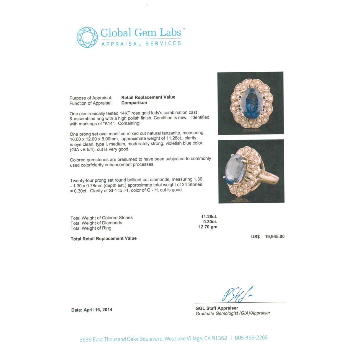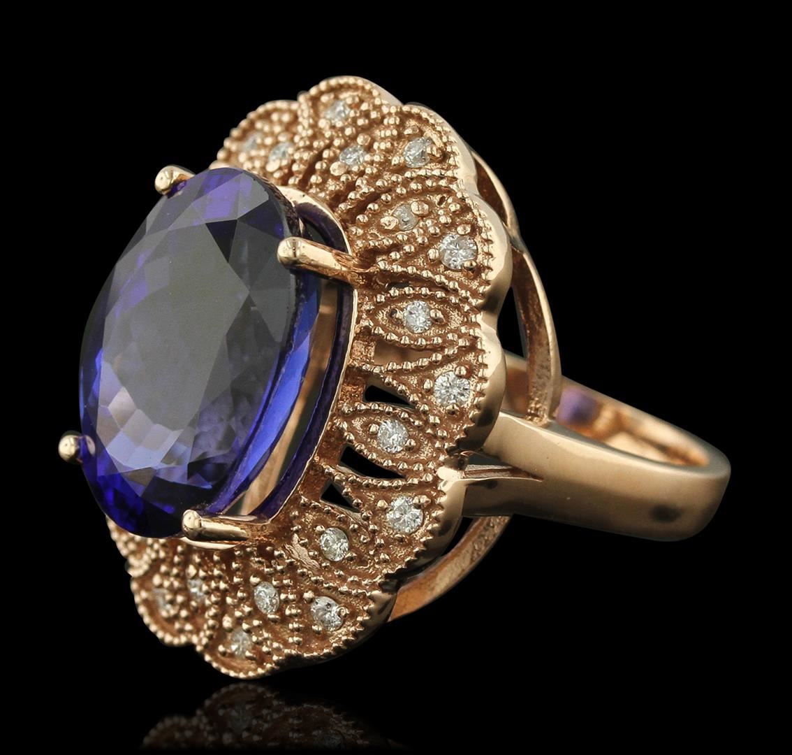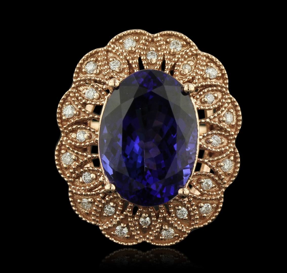 One electronically tested 14KT rose gold Ladies combination cast & assembled ring with a high polish finish. Condition is new. Identified with markings of "K14". Containing: One prong set oval modified mixed cut natural tanzanite, measuring 16.00 x 12.00 x 6.90mm, approximate weight of 11.28ct., clarity is eye clean, type I, medium, moderately strong, violetish blue color, (GIA vB 5/4), cut is very good. Colored gemstones are presumed to have been subjected to commonly used color/clarity enhancement processes. Twenty-Four prong set round brilliant cut diamonds, measuring 1.30 - 1.30 x 0.78mm (depth est.) approximate. Total Weight of 24 Stones = 0.30ct. Clarity: SI-1 to I-1. Color: G - H, Cut is Good. Total Weight of Colored Stones 11.28ct. Total Weight of Diamonds 0.30ct. Total Weight of Ring 12.70 grams. GGL Appraised at $19,945.00.