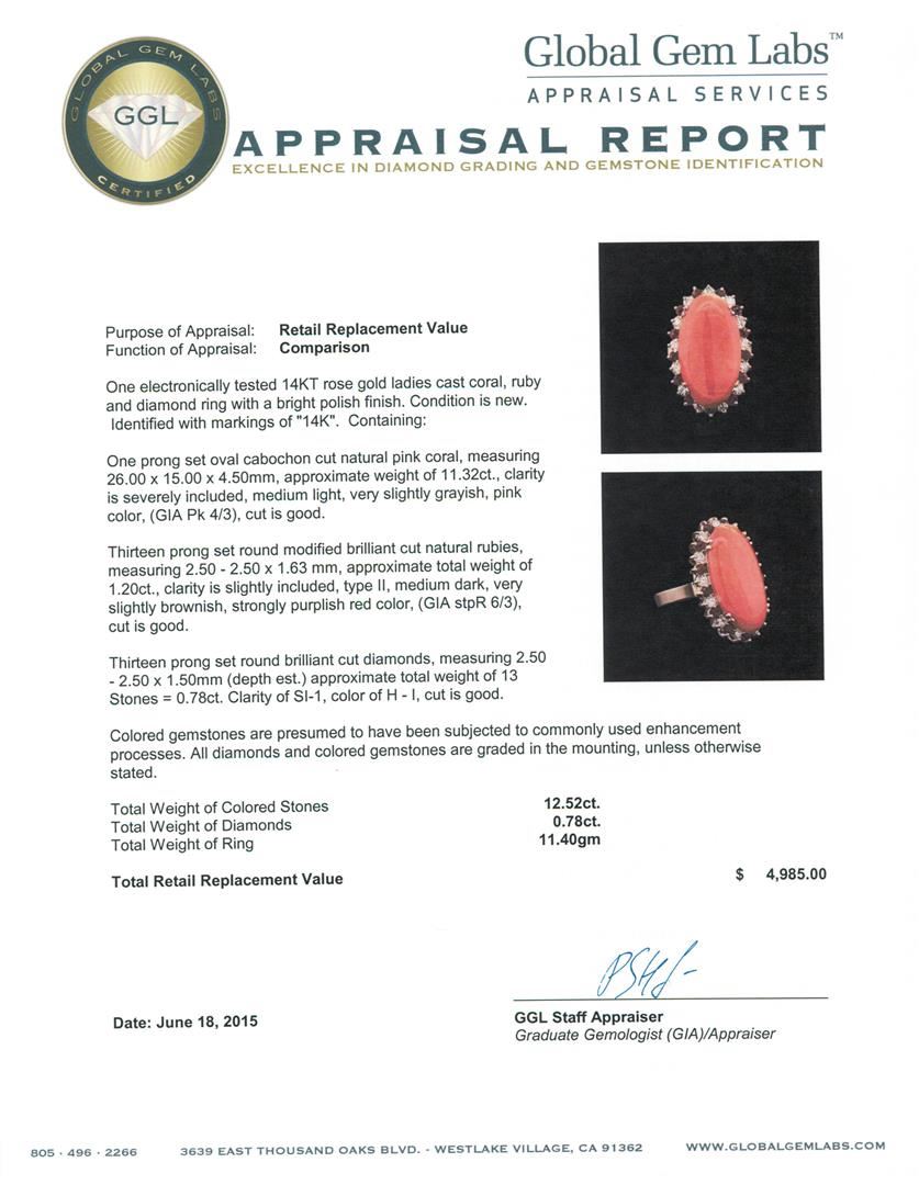 One electronically tested 14KT rose gold ladies cast coral, ruby and diamond ring with a bright polish finish. Identified with markings of "14K". Condition is new. Containing: One prong set oval cabochon cut natural pink coral, measuring 26.00 x 15.00 x 4.50mm, approximate weight of 11.32ct., clarity is severely included, medium light, very slightly grayish, pink color, (GIA Pk 4/3), cut is good. Thirteen prong set round modified brilliant cut natural rubies, measuring 2.50 - 2.50 x 1.63 mm, approximate total weight of 1.20ct., clarity is slightly included, type II, medium dark, very slightly brownish, strongly purplish red color, (GIA stpR 6/3), cut is good. Thirteen prong set round brilliant cut diamonds, measuring 2.50 - 2.50 x 1.50mm (depth est.) approximate total weight of 13 Stones = 0.78ct. Clarity: SI-1. Color: H - I, Cut is Good. Colored gemstones are presumed to have been subjected to commonly used enhancement processes. All diamonds and colored gemstones are graded in the mounting, unless otherwise stated. Total Weight of Colored Stones 12.52ct. Total Weight of Diamonds 0.78ct. Total Weight of Ring 11.40 grams. GGL Appraised at $4,985.00.