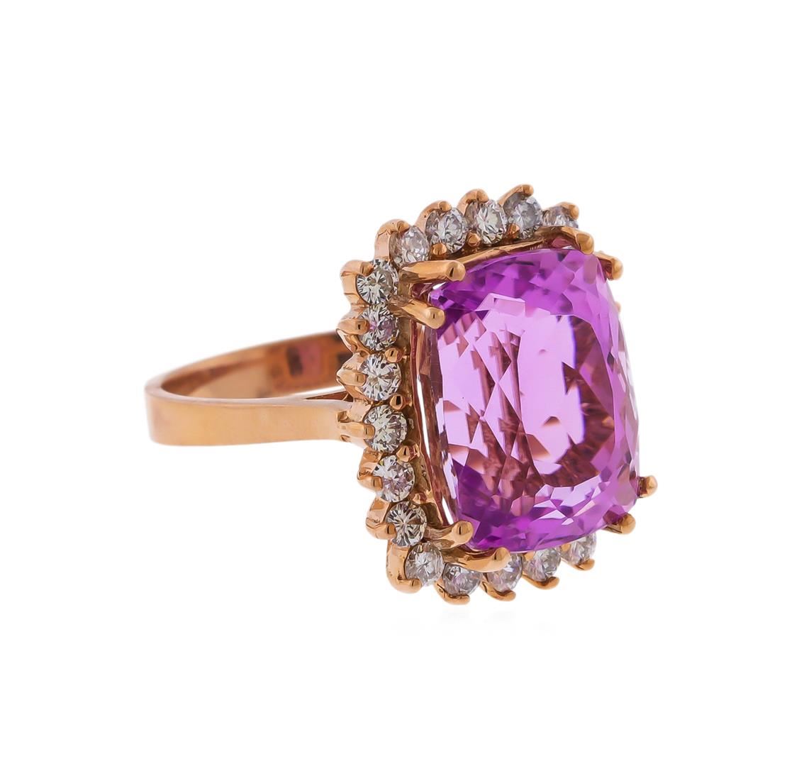 Containing 14KT Rose Gold Ring weighing approximately 7.50 grams. (1) Cushion Shaped Kunzite weighing approximately 11.42cts; Surrounded by diamonds weighing approximately 0.86ctw, Clarity: SI Clarity, Color: G-H. RBGS Appraised.