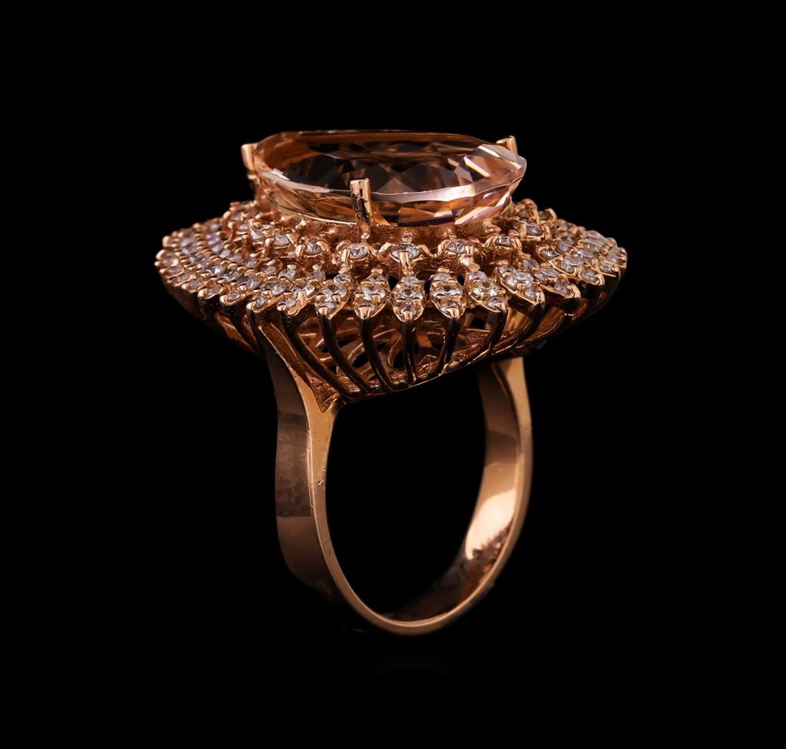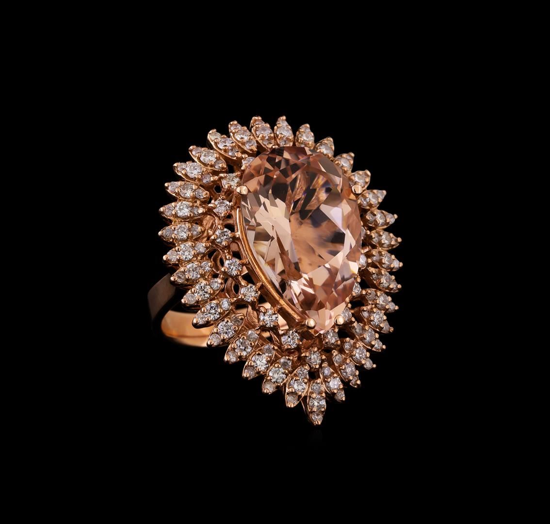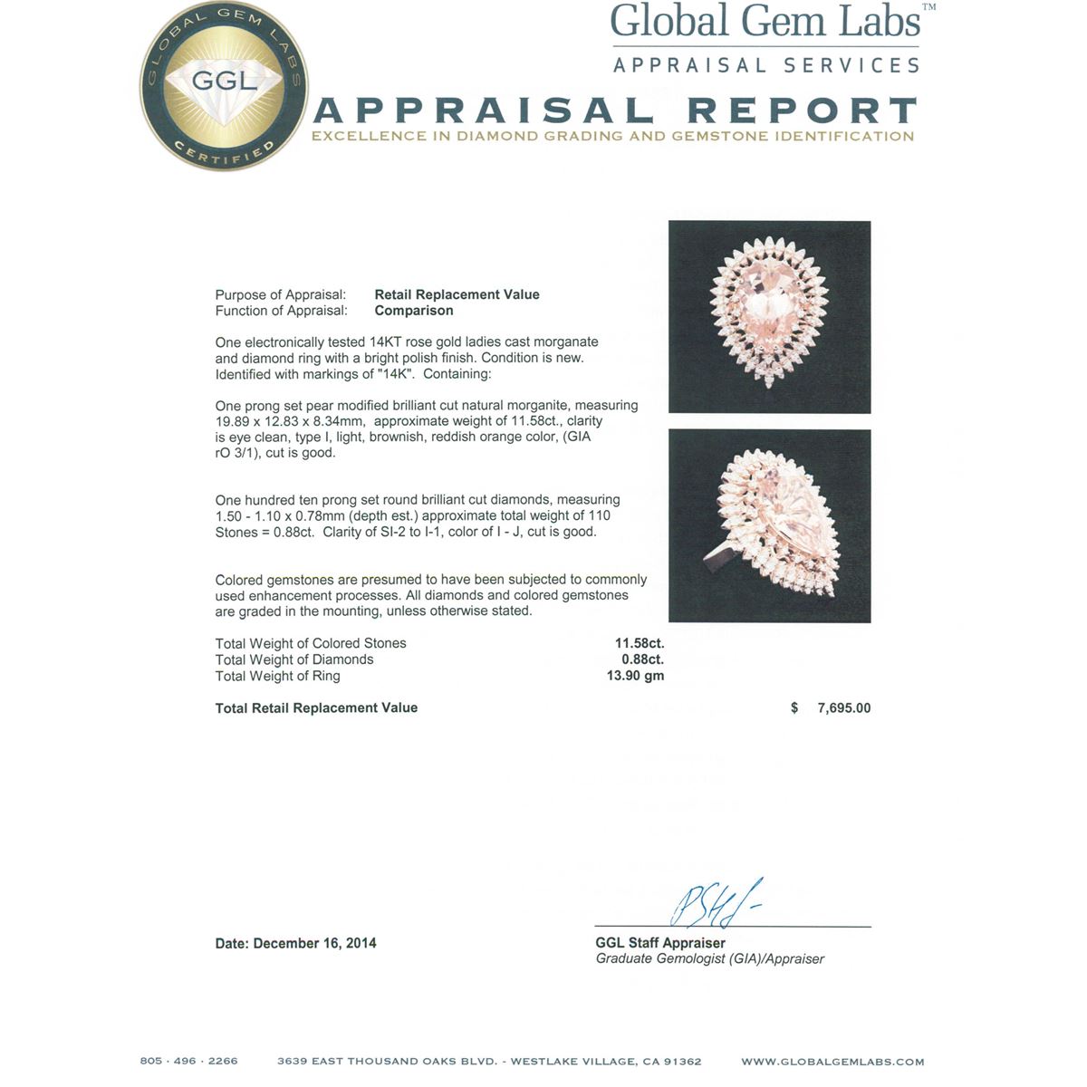 One electronically tested 14KT rose gold ladies cast morganite and diamond ring with a bright polish finish. Identified with markings of "14K". Condition is new. Containing: One prong set pear modified brilliant cut natural morganite, measuring 19.89 x 12.83 x 8.34mm, approximate weight of 11.58ct., clarity is eye clean, type I, light, brownish, reddish orange color, (GIA rO 3/1), cut is good. One Hundred Ten prong set round brilliant cut diamonds, measuring 1.50 - 1.10 x 0.78mm (depth est.) approximate total weight of 110 Stones = 0.88ct. Clarity: SI-2 to I-1. Color: I - J, Cut is Good. Colored gemstones are presumed to have been subjected to commonly used enhancement processes. All diamonds and colored gemstones are graded in the mounting, unless otherwise stated. Total Weight of Colored Stones 11.58ct. Total Weight of Diamonds 0.88ct. Total Weight of Ring 13.90 grams. GGL Appraised at $7,695.00.