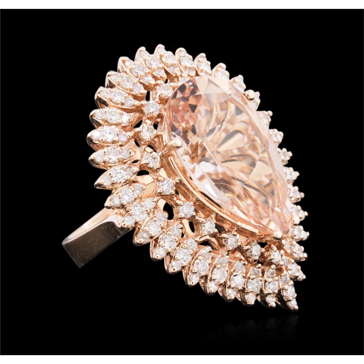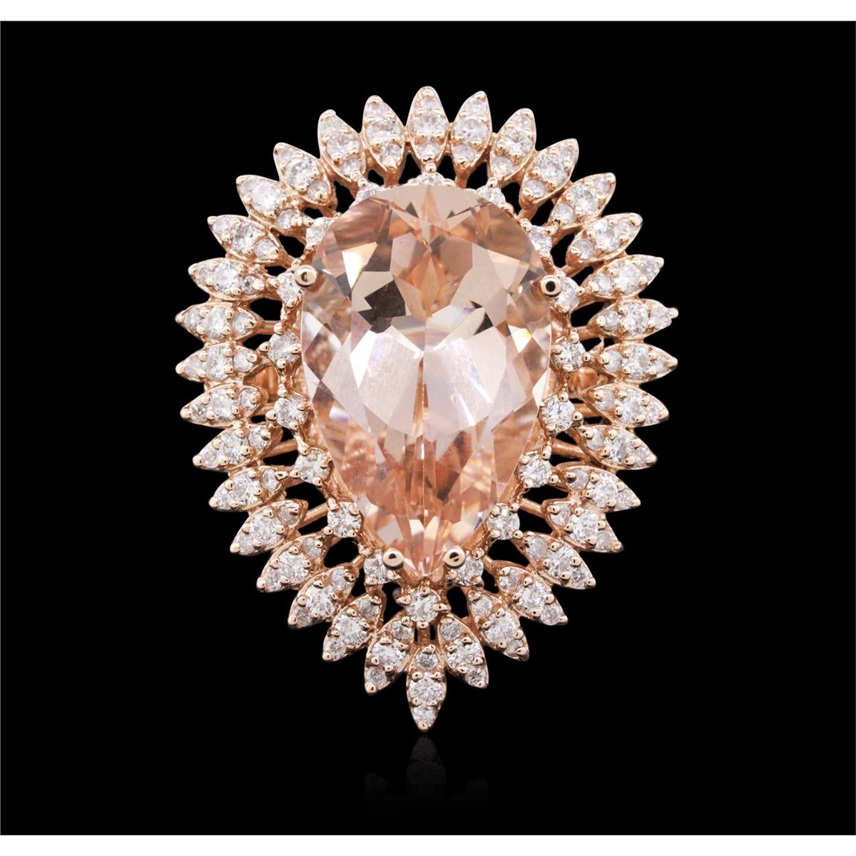 One electronically tested 14KT rose gold ladies cast morganite and diamond ring with a bright polish finish. Identified with markings of "14K". Condition is new. Containing: One prong set pear modified brilliant cut natural morganite, measuring 19.89 x 12.83 x 8.34mm, approximate weight of 11.58ct., clarity is eye clean, type I, light, brownish, reddish orange color, (GIA rO 3/1), cut is good. One Hundred Ten prong set round brilliant cut diamonds, measuring 1.50 - 1.10 x 0.78mm (depth est.) approximate total weight of 110 Stones = 0.88ct. Clarity: SI-2 to I-1. Color: I - J, Cut is Good. Colored gemstones are presumed to have been subjected to commonly used enhancement processes. All diamonds and colored gemstones are graded in the mounting, unless otherwise stated. Total Weight of Colored Stones 11.58ct. Total Weight of Diamonds 0.88ct. Total Weight of Ring 13.90 grams. GGL Appraised at $7,695.00.