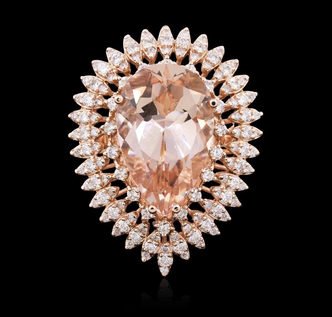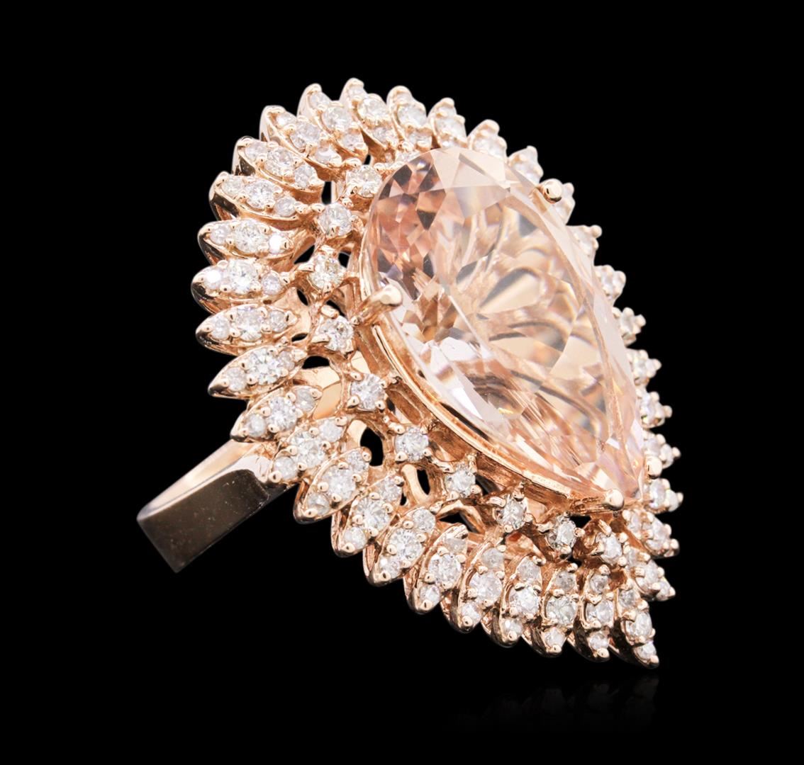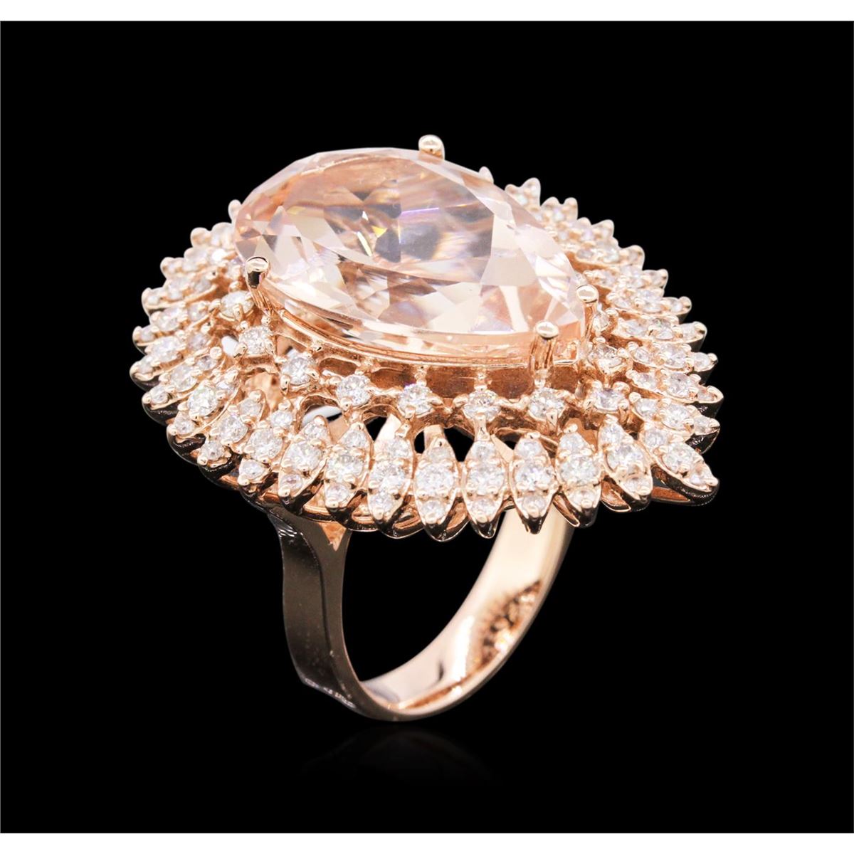 One electronically tested 14KT rose gold ladies cast morganite and diamond ring with a bright polish finish. Identified with markings of "14K". Condition is new. Containing: One prong set pear modified brilliant cut natural morganite, measuring 19.89 x 12.83 x 8.34mm, approximate weight of 11.58ct., clarity is eye clean, type I, light, brownish, reddish orange color, (GIA rO 3/1), cut is good. One Hundred Ten prong set round brilliant cut diamonds, measuring 1.50 - 1.10 x 0.78mm (depth est.) approximate total weight of 110 Stones = 0.88ct. Clarity: SI-2 to I-1. Color: I - J, Cut is Good. Colored gemstones are presumed to have been subjected to commonly used enhancement processes. All diamonds and colored gemstones are graded in the mounting, unless otherwise stated. Total Weight of Colored Stones 11.58ct. Total Weight of Diamonds 0.88ct. Total Weight of Ring 13.90 grams. GGL Appraised at $7,695.00.