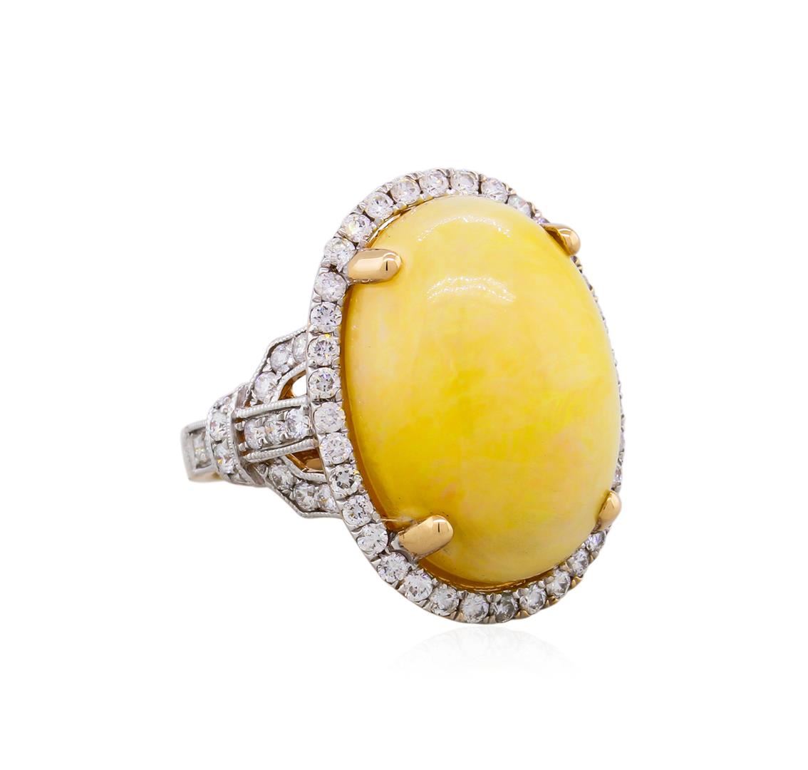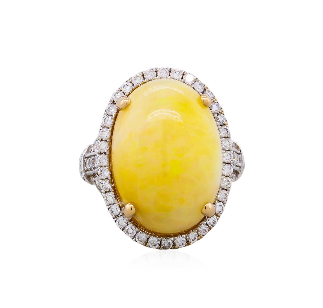 One beautiful opal and diamond ring set in 14KT rose gold weighing 5.55 grams containing a 12.04 carat oval shaped opal center stone beautifully showcased by 1.06 carats of round diamonds which extend down both sides of the band in this unique design.