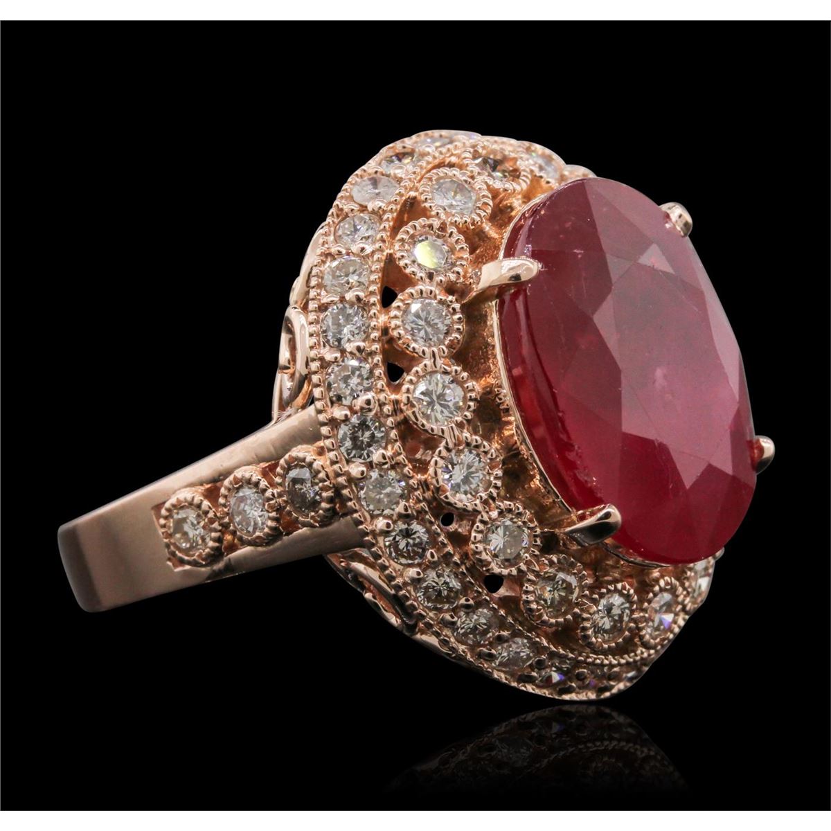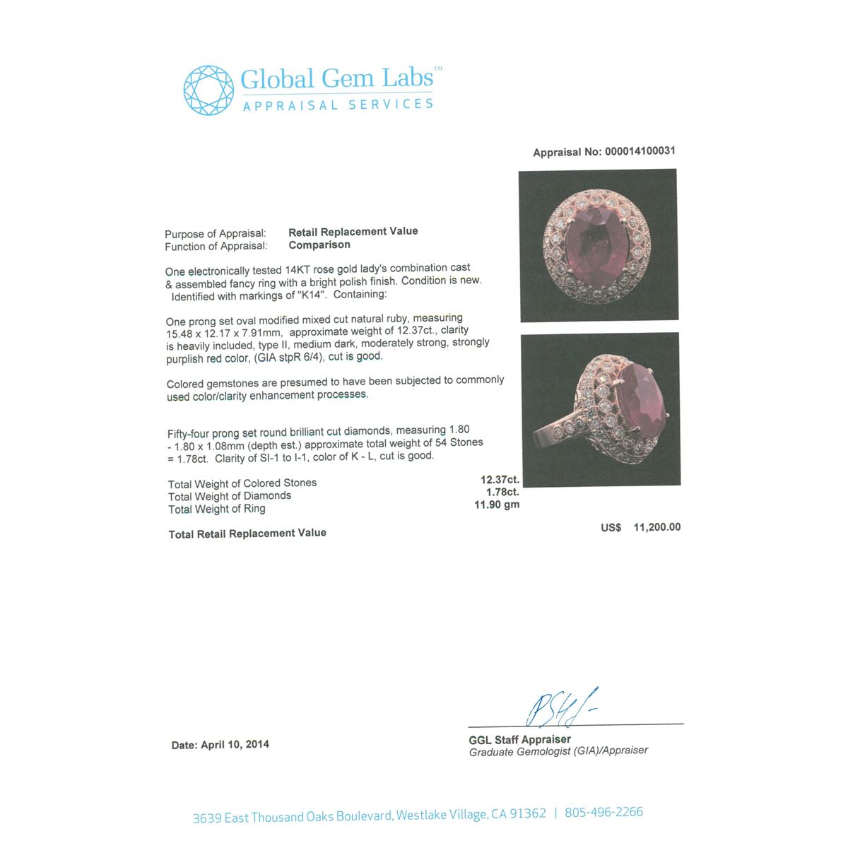 One electronically tested 14KT rose gold Ladies combination cast & assembled fancy ring with a bright polish finish. Condition is new. Identified with markings of "14K". Containing: One prong set oval modified mixed cut natural ruby, measuring 15.48 x 12.17 x 7.91mm, approximate weight of 12.37ct., clarity is heavily included, type II, medium dark, moderately strong, strongly purplish red color, (GIA stpR 6/4), cut is good. Colored gemstones are presumed to have been subjected to commonly used color/clarity enhancement processes. Fifty-Four prong set round brilliant cut diamonds, measuring 1.80 - 1.80 x 1.08mm (depth est.) approximate. Total Weight of 54 Stones = 1.78ct. Clarity: SI-1 to I-1. Color: K - L, Cut is Good. Total Weight of Colored Stones 12.37ct. Total Weight of Diamonds 1.78ct. Total Weight of Ring 11.90 grams. GGL Appraised at $11,200.00.