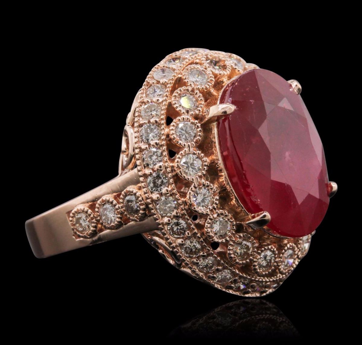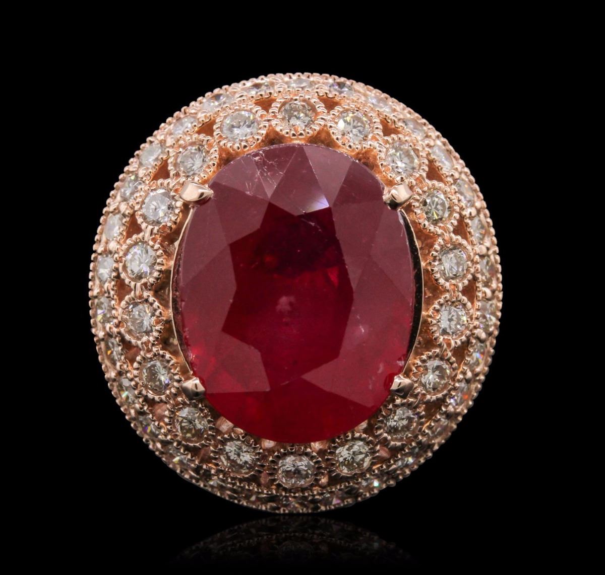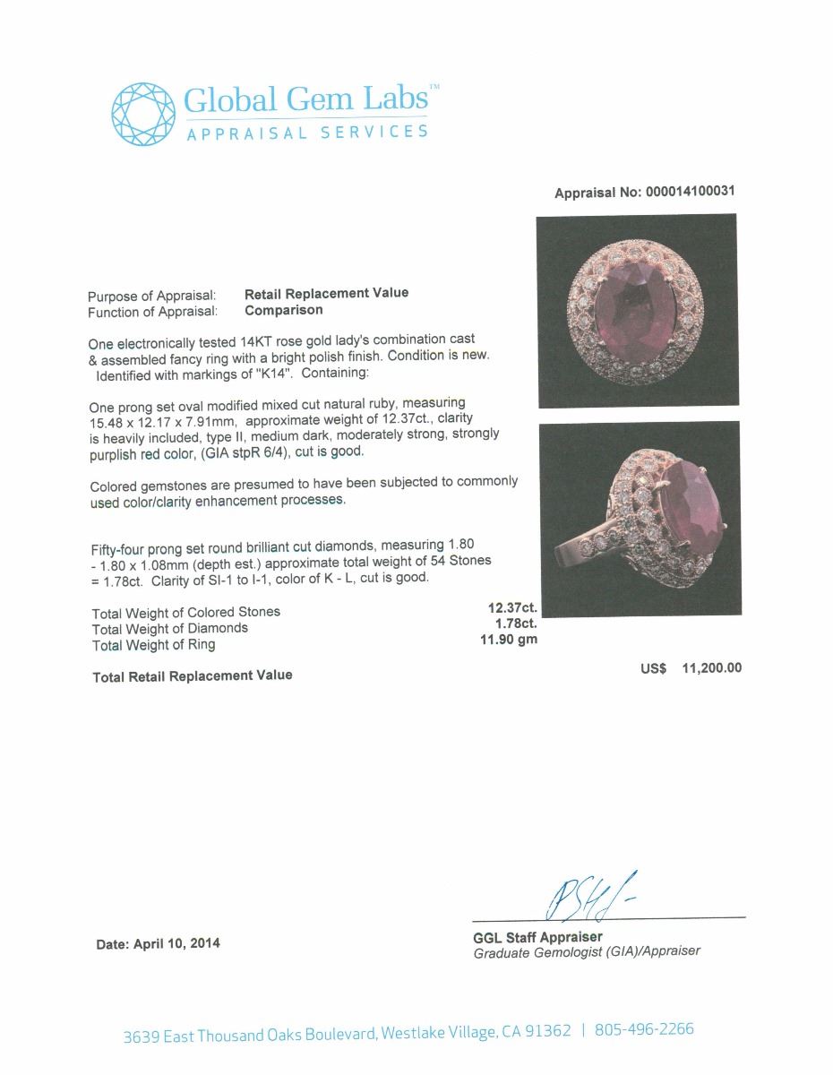 One electronically tested 14KT rose gold Ladies combination cast & assembled fancy ring with a bright polish finish. Condition is new. Identified with markings of "14K". Containing: One prong set oval modified mixed cut natural ruby, measuring 15.48 x 12.17 x 7.91mm, approximate weight of 12.37ct., clarity is heavily included, type II, medium dark, moderately strong, strongly purplish red color, (GIA stpR 6/4), cut is good. Colored gemstones are presumed to have been subjected to commonly used color/clarity enhancement processes. Fifty-Four prong set round brilliant cut diamonds, measuring 1.80 - 1.80 x 1.08mm (depth est.) approximate. Total Weight of 54 Stones = 1.78ct. Clarity: SI-1 to I-1. Color: K - L, Cut is Good. Total Weight of Colored Stones 12.37ct. Total Weight of Diamonds 1.78ct. Total Weight of Ring 11.90 grams. GGL Appraised at $11,200.00.