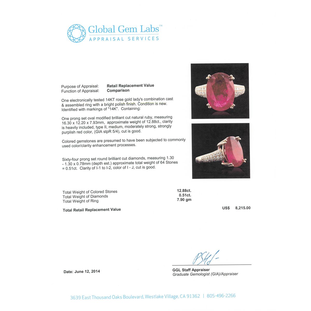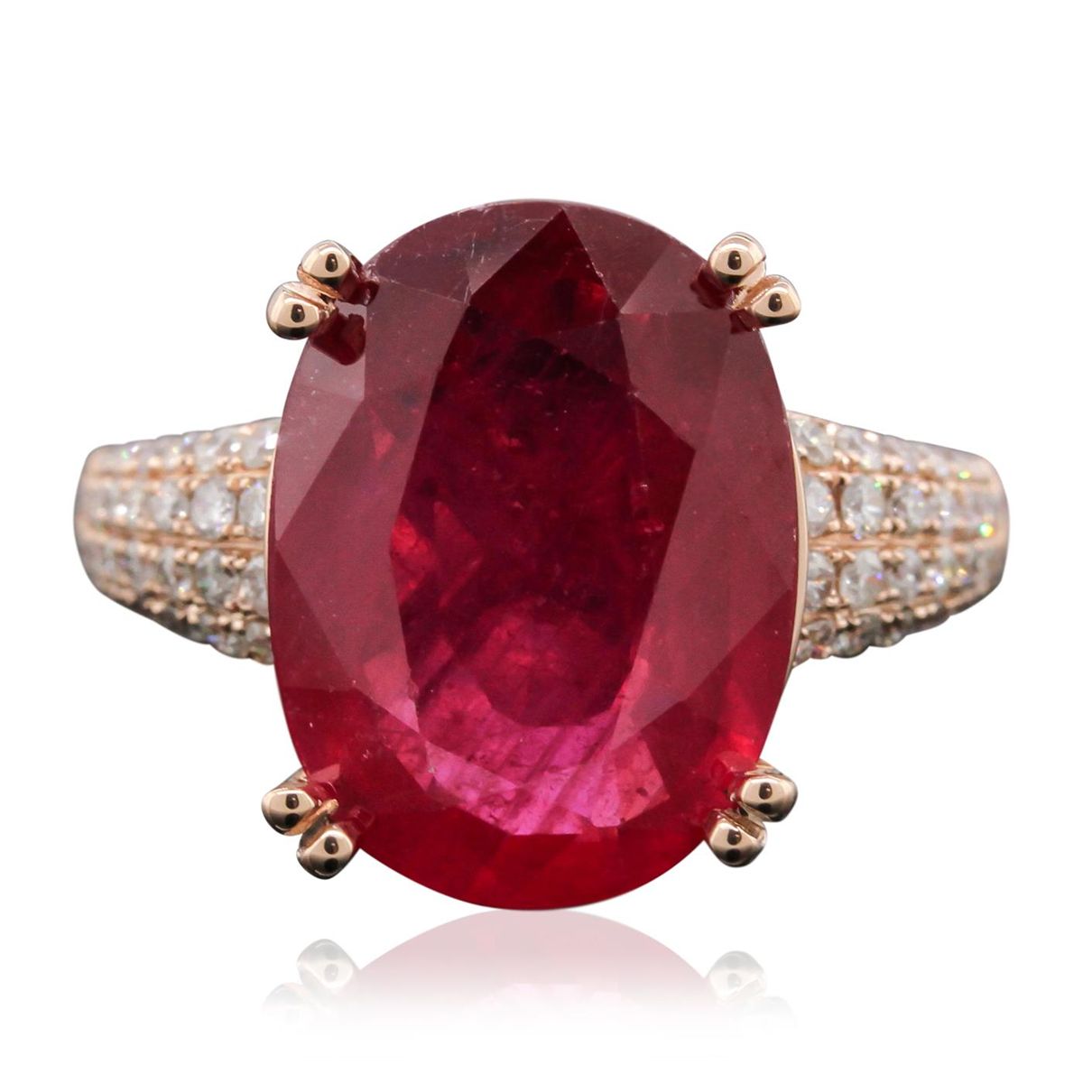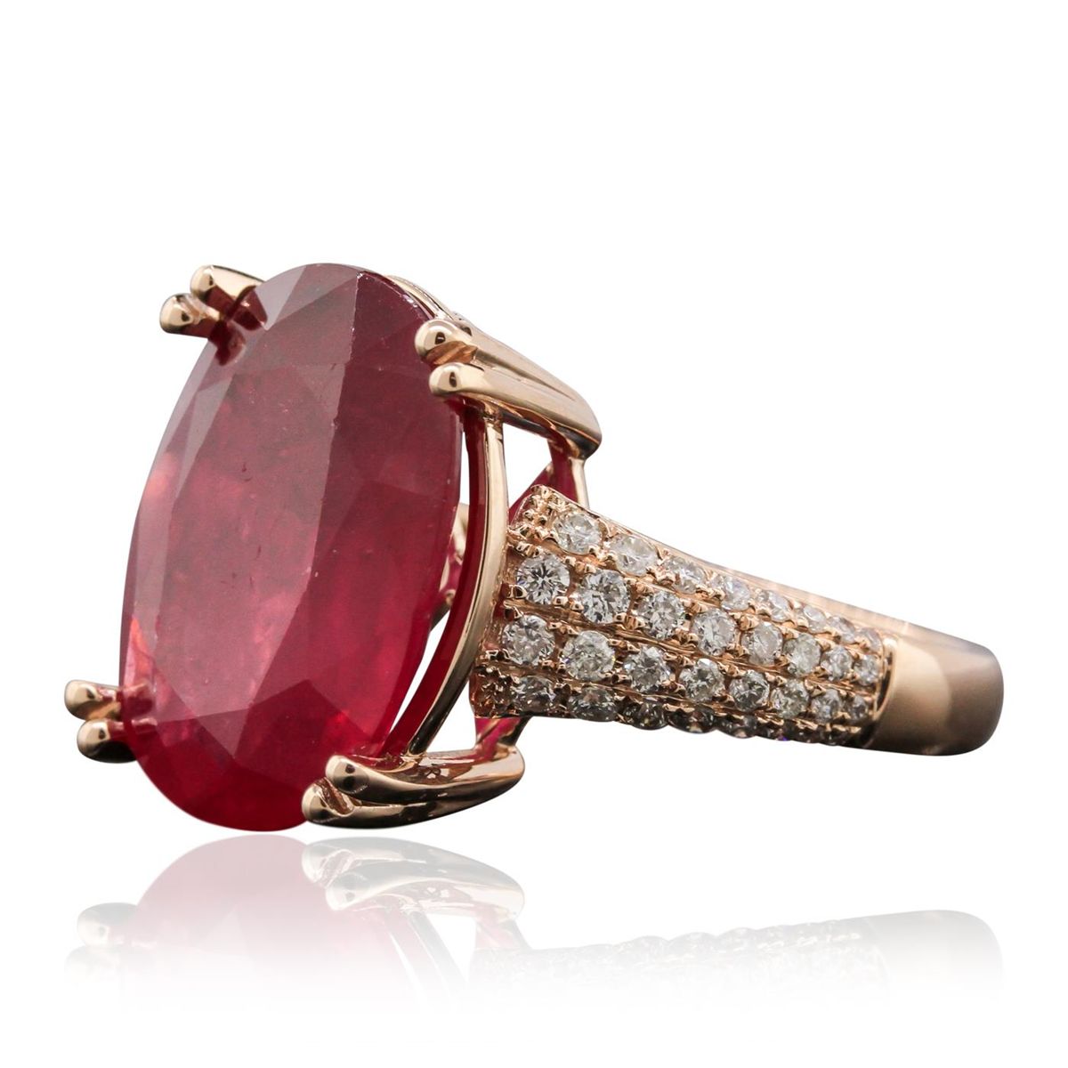 One electronically tested 14KT rose gold Ladies combination cast & assembled ring with a bright polish finish. Condition is new. Identified with markings of "14K". Containing: One prong set oval modified brilliant cut natural ruby, measuring 16.30 x 12.20 x 7.93mm, approximate weight of 12.88ct., clarity is heavily included, type II, medium, moderately strong, strongly purplish red color, (GIA stpR 5/4), cut is good. Colored gemstones are presumed to have been subjected to commonly used color/clarity enhancement processes. Sixty-Four prong set round brilliant cut diamonds, measuring 1.30 - 1.30 x 0.78mm (depth est.) approximate. Total Weight of 64 Stones = 0.51ct. . Clarity: I-1 to I-2. Color: I - J, Cut is Good. . Total Weight of Colored Stones 12.88ct. Total Weight of Diamonds 0.51ct. Total Weight of Ring 7.90 grams. GGL Appraised at $8,215.00.