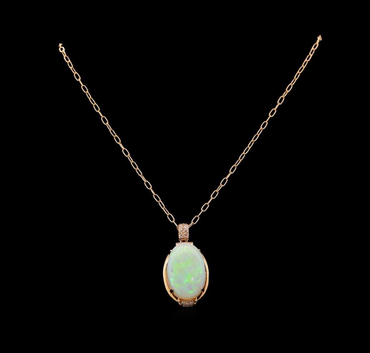 One electronically tested Gold-Rose-14KT ladies cast opal and diamond pendant & chain 18.0" long, with a lobster claw clasp with a bright polish finish. Identified with markings of "14K". Condition is new. Containing: One white opal that is cut in a oval shape and is prong set, measuring 26.00. mm long x 17.00. mm wide, and 6.50 mm thick and the approximate weight is 12.92 carats. The opal has a somewhat bright, green only play of color (fire) in a flashfire pattern; a medium dome; a good cut; no inclusions; consistent in its brightness and pattern; and is somewhat directional. Twenty prong set round brilliant cut diamonds, measuring 1.30 - 1.30 x 0.78mm (depth est.) approximate total weight of 20 Stones = 0.16ct. Clarity: I-1 to I-2. Color: I - J. Colored gemstones are presumed to have been subjected to commonly used enhancement processes. All diamonds and colored gemstones are graded in the mounting, unless otherwise stated. Total Weight of Diamonds 0.16ct. Total Weight of Opals 12.92ct. Total Weight of Pendant & Chain 15.90 grams. GGL Appraised.