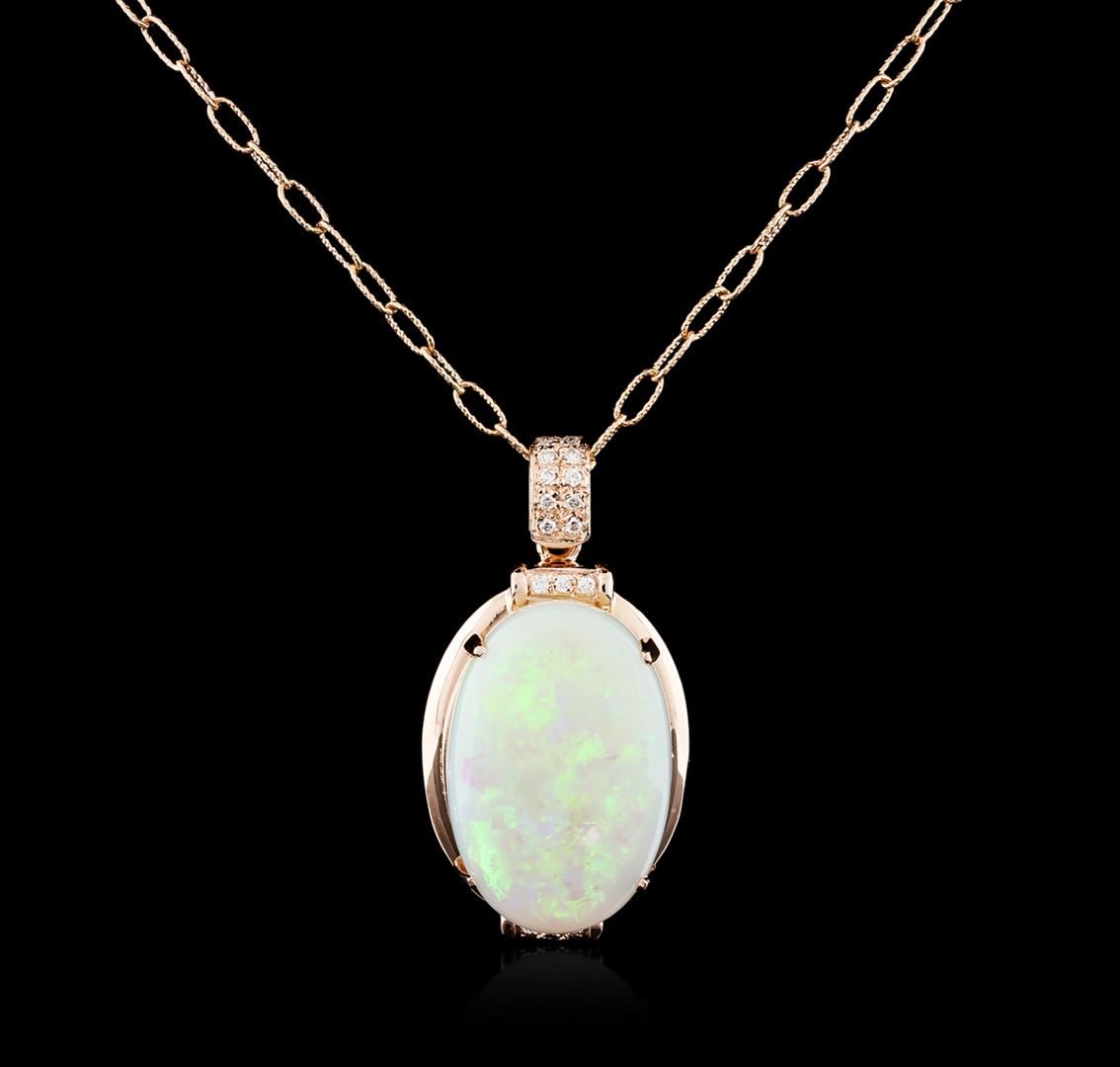 One electronically tested Gold-Rose-14KT ladies cast opal and diamond pendant & chain 18.0" long, with a lobster claw clasp with a bright polish finish. Identified with markings of "14K". Condition is new. Containing: One white opal that is cut in a oval shape and is prong set, measuring 26.00. mm long x 17.00. mm wide, and 6.50 mm thick and the approximate weight is 12.92 carats. The opal has a somewhat bright, green only play of color (fire) in a flashfire pattern; a medium dome; a good cut; no inclusions; consistent in its brightness and pattern; and is somewhat directional. Twenty prong set round brilliant cut diamonds, measuring 1.30 - 1.30 x 0.78mm (depth est.) approximate total weight of 20 Stones = 0.16ct. Clarity: I-1 to I-2. Color: I - J. Colored gemstones are presumed to have been subjected to commonly used enhancement processes. All diamonds and colored gemstones are graded in the mounting, unless otherwise stated. Total Weight of Diamonds 0.16ct. Total Weight of Opals 12.92ct. Total Weight of Pendant & Chain 15.90 grams. GGL Appraised at $5,500.00.
