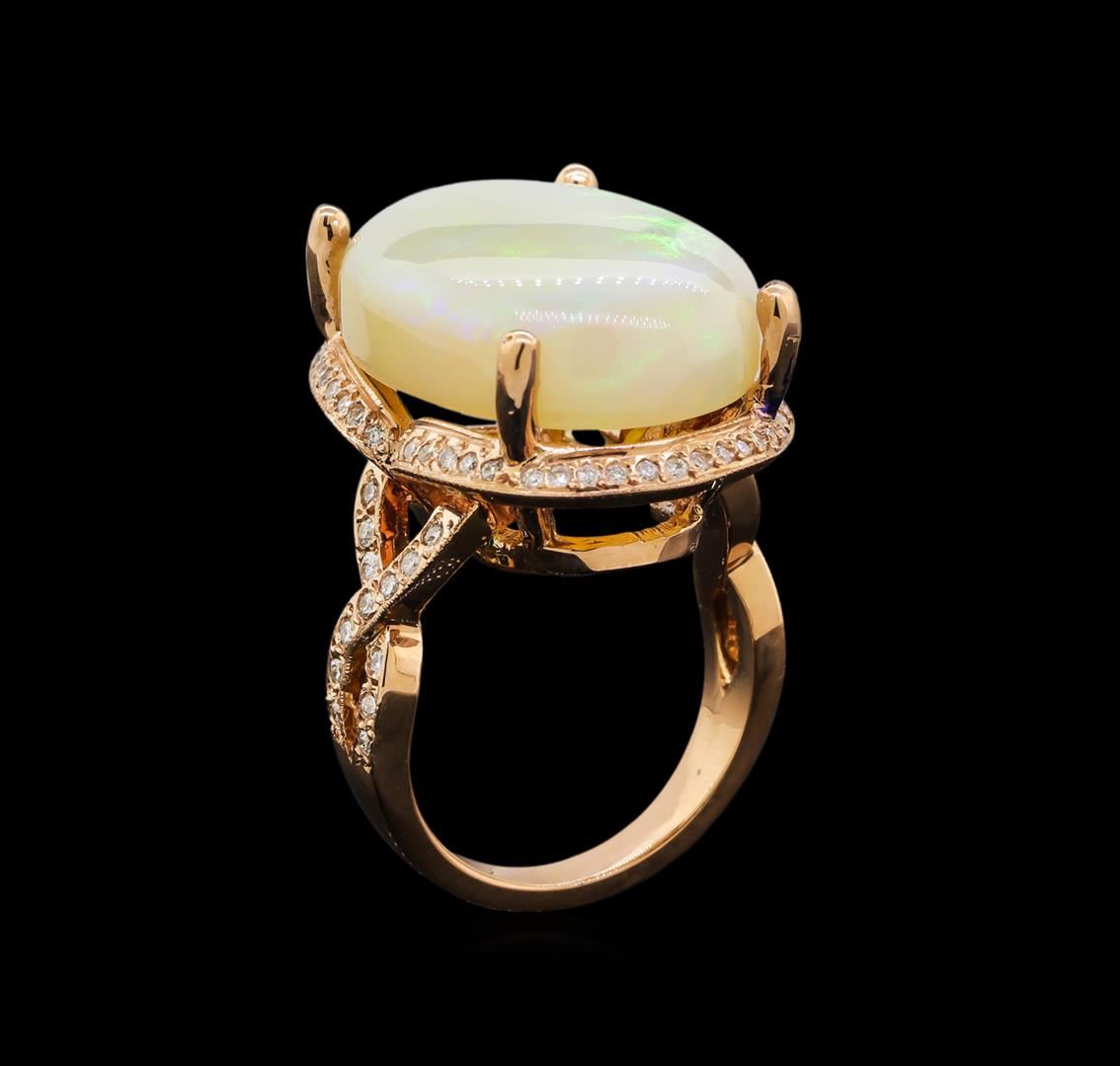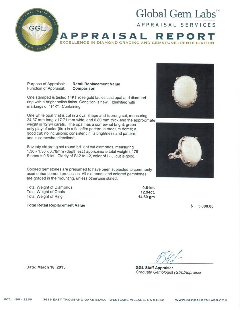 One stamped & tested 14KT rose gold ladies cast opal and diamond ring with a bright polish finish. Identified with markings of "14K". Condition is new. Containing: One white opal that is cut in a oval shape and is prong set, measuring 24.37 mm long x 17.71 mm wide, and 6.80 mm thick and the approximate weight is 12.94 carats. The opal has a somewhat bright, green only play of color (fire) in a flashfire pattern; a medium dome; a good cut; no inclusions; consistent in its brightness and pattern; and is somewhat directional. Seventy-Six prong set round brilliant cut diamonds, measuring 1.30 - 1.30 x 0.78mm (depth est.) approximate total weight of 76 Stones = 0.61ct. Clarity of SI-2 to I-2, Color of I - J, Cut is Good. Colored gemstones are presumed to have been subjected to commonly used enhancement processes. All diamonds and colored gemstones are graded in the mounting, unless otherwise stated. Total Weight of Diamonds 0.61ct. Total Weight of Opals 12.94ct. Total Weight of Ring 14.60 grams. GGL Appraised at $5,800.00.