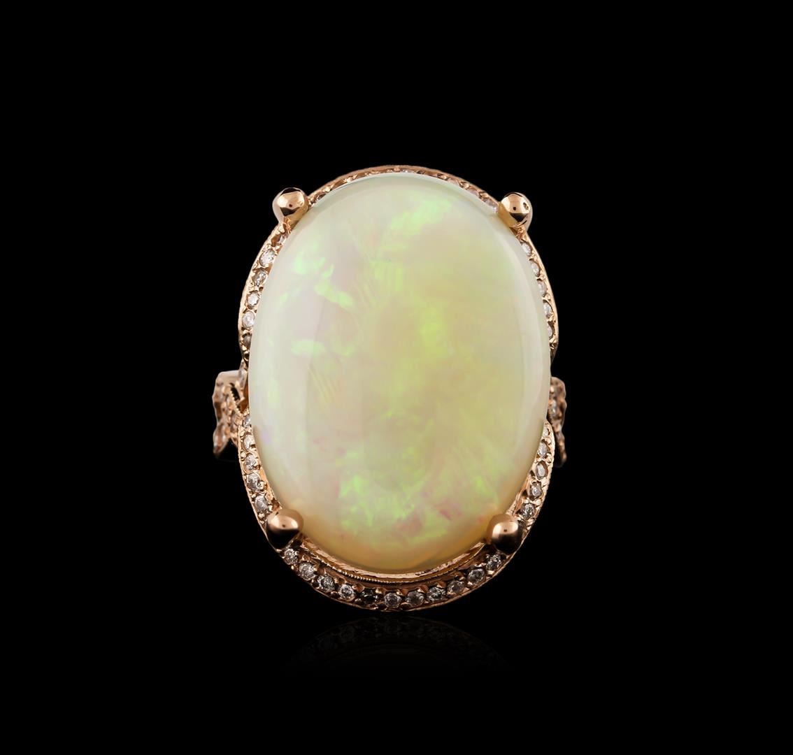 One stamped & tested 14KT rose gold ladies cast opal and diamond ring with a bright polish finish. Identified with markings of "14K". Condition is new. Containing: One white opal that is cut in a oval shape and is prong set, measuring 24.37 mm long x 17.71 mm wide, and 6.80 mm thick and the approximate weight is 12.94 carats. The opal has a somewhat bright, green only play of color (fire) in a flashfire pattern; a medium dome; a good cut; no inclusions; consistent in its brightness and pattern; and is somewhat directional. Seventy-Six prong set round brilliant cut diamonds, measuring 1.30 - 1.30 x 0.78mm (depth est.) approximate total weight of 76 Stones = 0.61ct. Clarity of SI-2 to I-2, Color of I - J, Cut is Good. Colored gemstones are presumed to have been subjected to commonly used enhancement processes. All diamonds and colored gemstones are graded in the mounting, unless otherwise stated. Total Weight of Diamonds 0.61ct. Total Weight of Opals 12.94ct. Total Weight of Ring 14.60 grams. GGL Appraised at $5,800.00.