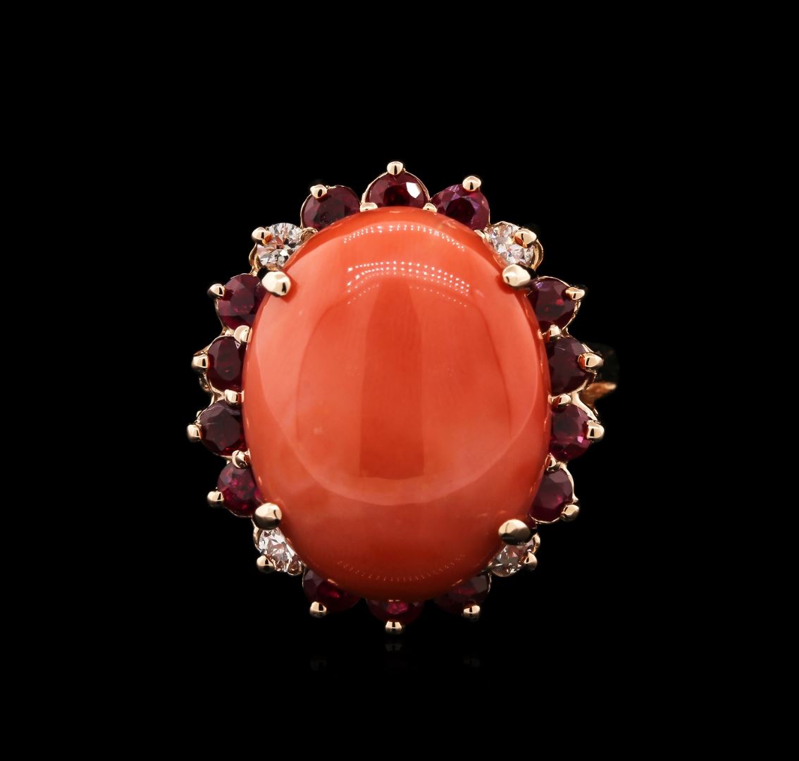 One electronically tested 14KT rose gold ladies cast coral, ruby and diamond ring with a bright polish finish. Identified with markings of "14K". Condition is new. Containing: One prong set oval cabochon cut natural pink coral, measuring 19.00 x 16.50 x 6.88mm, approximate weight of 13.08ct., clarity is severely included, light, very slightly grayish, pink color, (GIA Pk 3/3), cut is good. Fourteen prong set round modified brilliant cut natural rubies, measuring 3.00 - 3.00 x 1.95 mm, approximate total weight of 1.64ct., clarity is slightly included, type II, medium dark, very slightly brownish, strongly purplish red color, (GIA stpR 6/3), cut is good. Four prong set round brilliant cut diamonds, measuring 3.00 - 3.00 x 1.80mm (depth est.) approximate total weight of 4 Stones = 0.30ct. Clarity: SI-2. Color: G - H, Cut is Good. Colored gemstones are presumed to have been subjected to commonly used enhancement processes. All diamonds and colored gemstones are graded in the mounting, unless otherwise stated. Total Weight of Colored Stones 14.72ct. Total Weight of Diamonds 0.30ct. Total Weight of Ring 11.30 grams. GGL Appraised at $4,620.00.