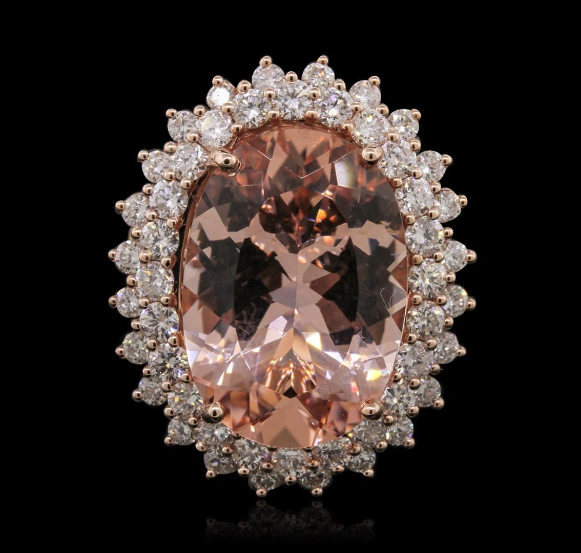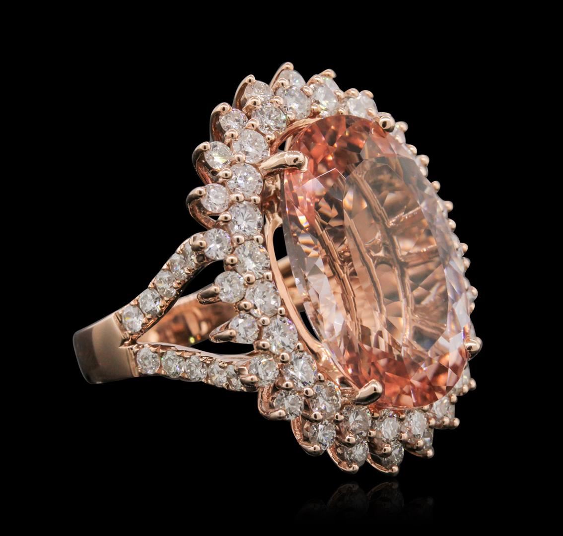 One electronically tested 14KT rose gold Ladies combination cast & assembled fashion ring with a bright polish finish. Condition is new. Identified with markings of "14K". Containing: One prong set oval modified mixed cut natural morganite, measuring 20.00 x 14.00 x 8.65mm, approximate weight of 13.41ct., clarity is eye clean, type I, light, slightly brownish, red orange color, (GIA RO 3/2), cut is very good. Colored gemstones are presumed to have been subjected to commonly used and possible undetectable color/clarity enhancement processes. Twenty prong set round brilliant cut diamonds, measuring 2.00 - 2.00 x 1.20mm (depth est.) approximate. Total Weight of 20 Stones = 0.25ct. Clarity: SI-1 to SI-2. Color: G, Cut is Good. Forty-Eight prong set round brilliant cut diamonds, measuring 2.50 - 2.50 x 1.50mm (depth est.) approximate. Total Weight of 48 Stones = 2.74ct. Clarity: SI-1 to SI-2. Color: H - I, Cut is Good. Total Weight of Colored Stones 13.41ct. Total Weight of Diamonds 2.99ct. Total Weight of Ring 11.10 grams. GGL Appraised at $16,040.00.