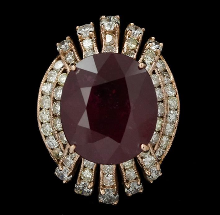 One electronically tested 14KT rose gold ladies cast ruby and diamond ring. Condition is good. The featured rub yis set within an elaborate diamond lattice gallery, completed by a two and one-half millimeter wide band. Bright polish finish with migraine detailing throughout. Identified with the marking of "k14". Containing: One prong set oval mixed cut natural ruby, measuring 15.00 x 13.10 x 7.70mm, 10% bulge factor, approximate weight of 13.42ct., clarity is heavily included, typeII, dark, very slightly brownish, slightly purplish red color, (GIA slpR 7/3), cut is good. Transmitting light somewhat diffusely , transparent to translucent. Naturally occurring internal and external characteristics are present. Indication of laboratory high temperature heat treatment, with glass and flux additives. Graded in the setting. Ruby has a low tolerance to rhodium plating, repolishing the surface and ultrasonic cleaning. Fifty -six prong and chanel set round brilliant cut diamonds, measuring 2.50 - 2.00 x 1.35mm (depth est.) approximate total weight of 56 stones = 2.03ct. Graded in the setting. Clarity SI-1 to I-1. Color H - J. Total weight of colored stones 13.42ct. Total weight of Diamonds 2.03ct. Total weight of ring 9.56gm. AIG Appraised at $10,640.00.
