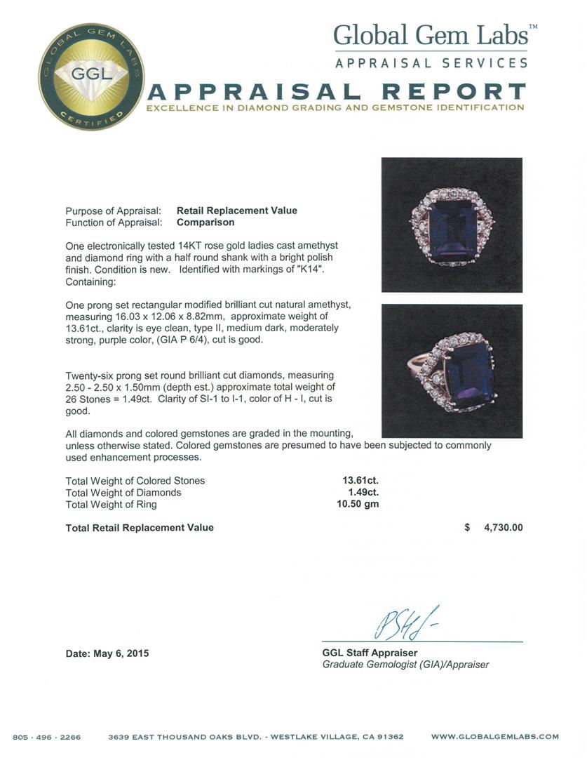 One electronically tested 14KT rose gold ladies cast amethyst and diamond ring with a half round shank with a bright polish finish. Identified with markings of "K14". Condition is new. Containing: One prong set rectangular modified brilliant cut natural amethyst, measuring 16.03 x 12.06 x 8.82mm, approximate weight of 13.61ct., clarity is eye clean, type II, medium dark, moderately strong, purple color, (GIA P 6/4), cut is good. Twenty-Six prong set round brilliant cut diamonds, measuring 2.50 - 2.50 x 1.50mm (depth est.) approximate total weight of 26 Stones = 1.49ct. Clarity: SI-1 to I-1. Color: H - I, Cut is Good. All diamonds and colored gemstones are graded in the mounting, unless otherwise stated. Colored gemstones are presumed to have been subjected to commonly used enhancement processes. Total Weight of Colored Stones 13.61ct. Total Weight of Diamonds 1.49ct. Total Weight of Ring 10.50 grams. GGL Appraised at $4,730.00.