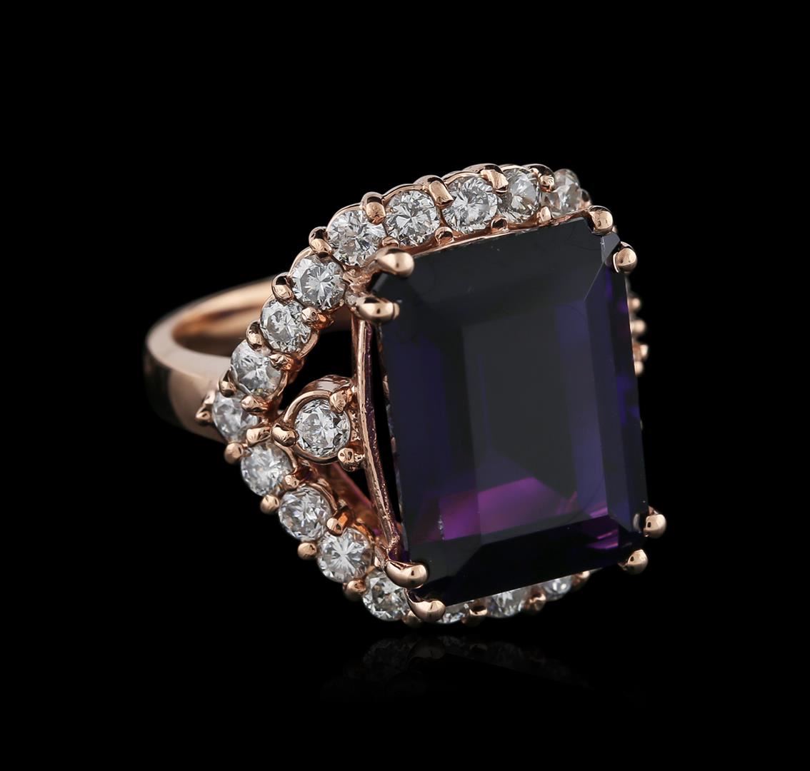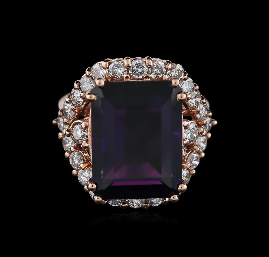 One electronically tested 14KT rose gold ladies cast amethyst and diamond ring with a half round shank with a bright polish finish. Identified with markings of "K14". Condition is new. Containing: One prong set rectangular modified brilliant cut natural amethyst, measuring 16.03 x 12.06 x 8.82mm, approximate weight of 13.61ct., clarity is eye clean, type II, medium dark, moderately strong, purple color, (GIA P 6/4), cut is good. Twenty-Six prong set round brilliant cut diamonds, measuring 2.50 - 2.50 x 1.50mm (depth est.) approximate total weight of 26 Stones = 1.49ct. Clarity: SI-1 to I-1. Color: H - I, Cut is Good. All diamonds and colored gemstones are graded in the mounting, unless otherwise stated. Colored gemstones are presumed to have been subjected to commonly used enhancement processes. Total Weight of Colored Stones 13.61ct. Total Weight of Diamonds 1.49ct. Total Weight of Ring 10.50 grams. GGL Appraised at $4,730.00.