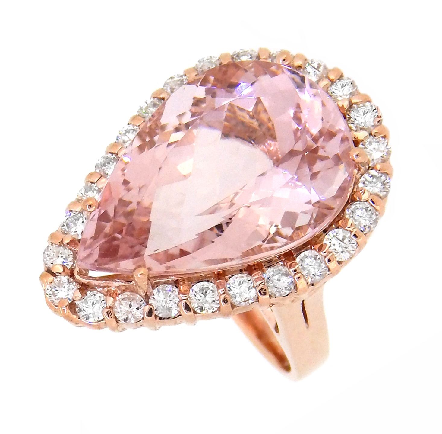One 14KT Rose Gold 14.10ct Morganite and Diamond Ring. (1) Morganite with a total weight of 14.10cts. (25) diamonds with a total weight of 1.11cts. Total weight of this ring is 11.7 grams.